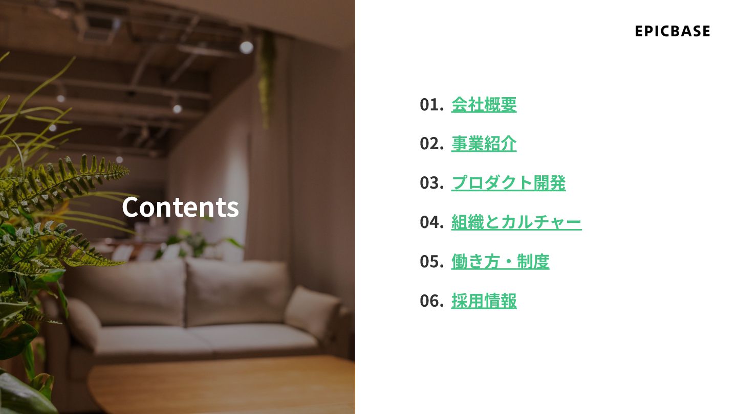 01. 会社概要 02. 事業紹介 03. プロダクト開発 04. 組織とカルチャー 05. 働き⽅‧制度
