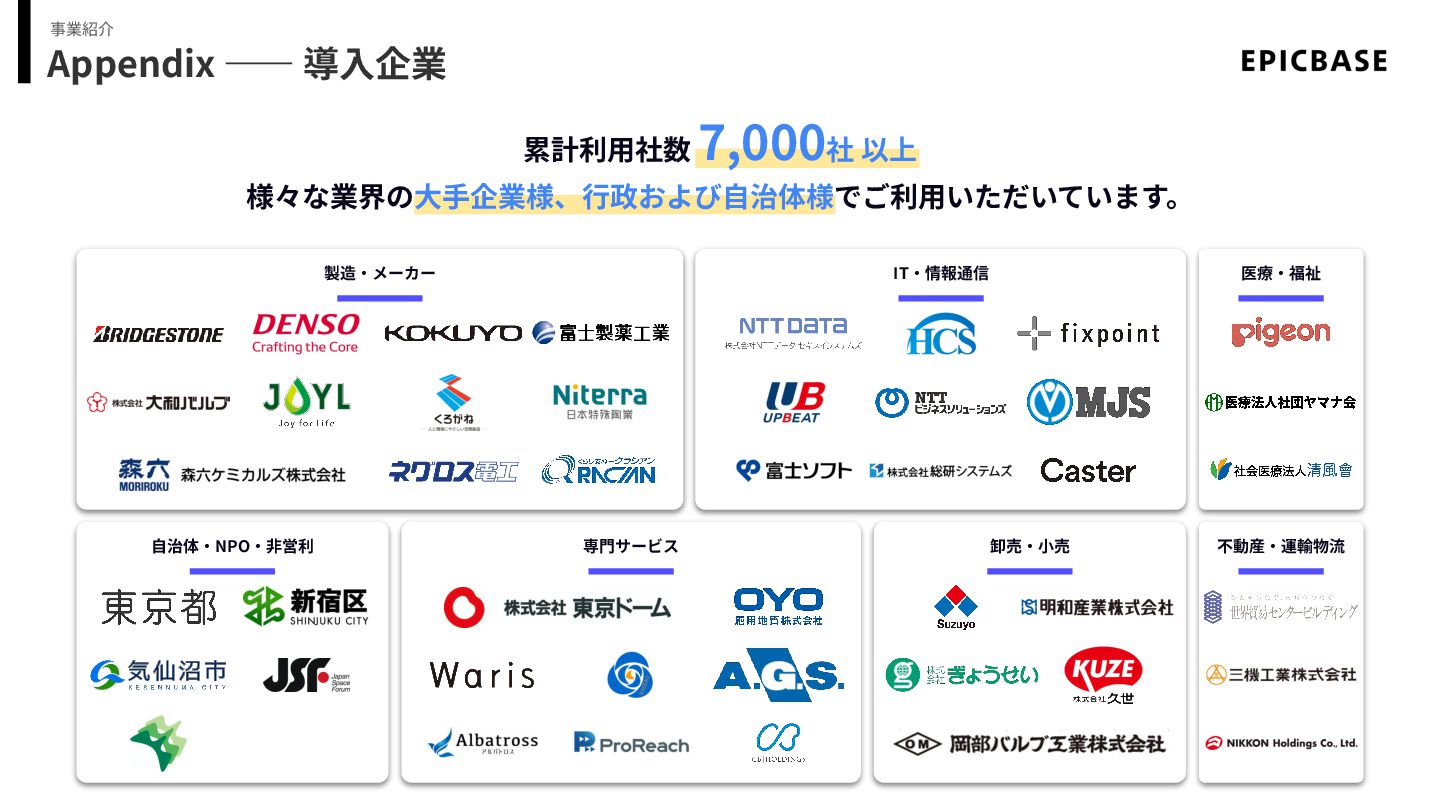 Appendix ―― 導⼊企業 事業紹介 累計利⽤社数 7,000社 以上 様々な業界の⼤⼿企業様、⾏政および⾃治体様でご利⽤いただいています。 製造‧メーカー IT‧情報通信