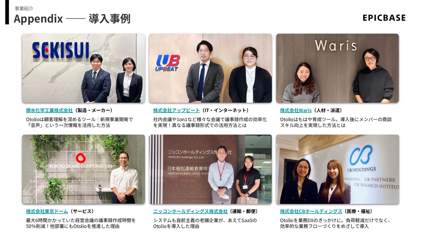 Appendix ―― 導⼊事例 事業紹介 積⽔化学⼯業株式会社(製造‧メーカー) Otolioは顧客理解を深めるツール|新規事業開発で 「⾳声」という⼀次情報を活⽤した⽅法 株式会社アップビート(IT‧インターネット) 社内会議や1on1など様々な会議で議事録作成の効率化 を実現!異なる議事録形式での活⽤⽅法とは