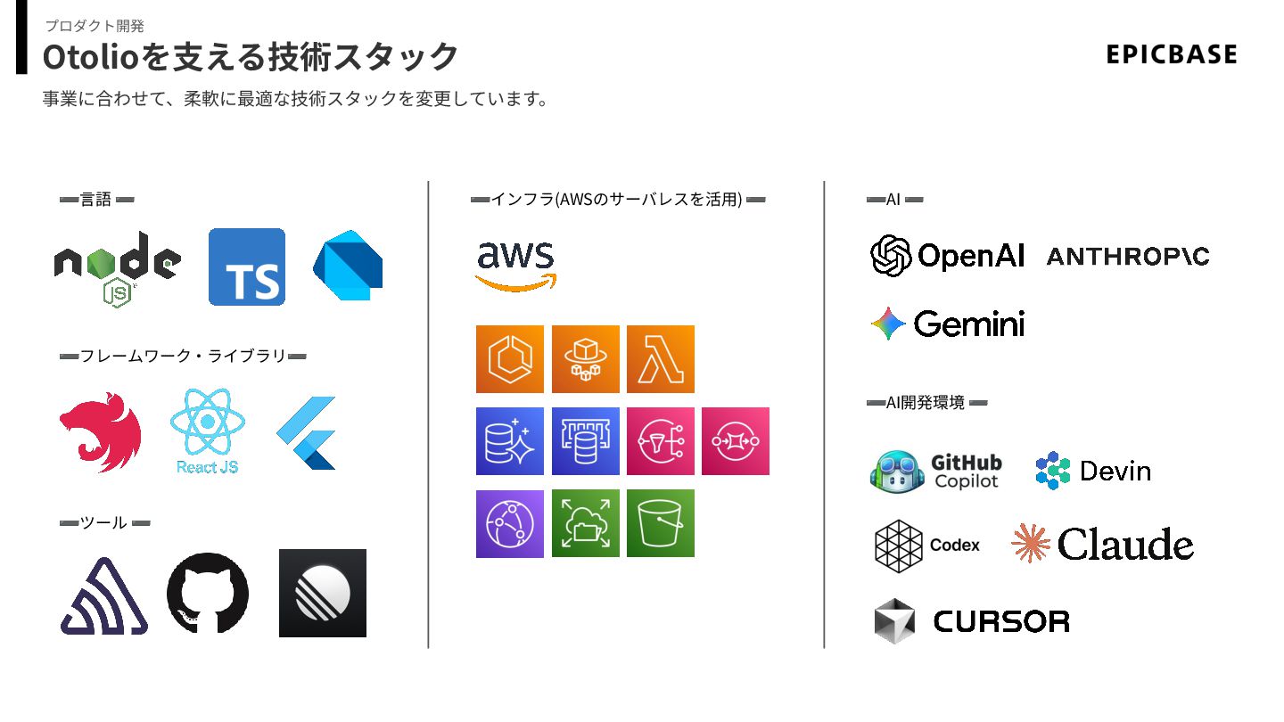 Otolioを⽀える技術スタック 事業に合わせて、柔軟に最適な技術スタックを変更しています。 プロダクト開発 ➖⾔語 ➖ ➖フレームワーク‧ライブラリ➖ ➖ツール ➖ ➖インフラ(AWSのサーバレスを活⽤) ➖