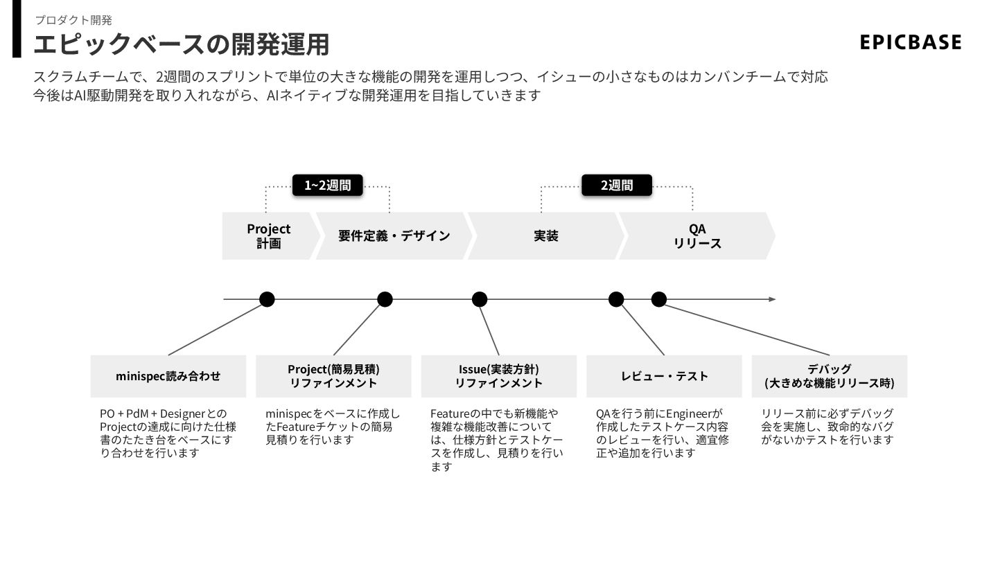 エピックベースの開発運⽤ スクラムチームで、2週間のスプリントで単位の⼤きな機能の開発を運⽤しつつ、イシューの⼩さなものはカンバンチームで対応 今後はAI駆動開発を取り⼊れながら、AIネイティブな開発運⽤を⽬指していきます プロダクト開発 Project 計画 要件定義‧デザイン 実装 QA リリース