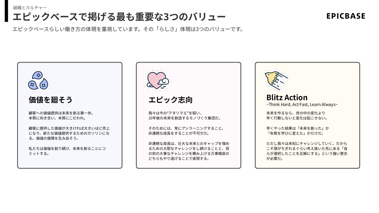 エピックベースで掲げる最も重要な3つのバリュー エピックベースらしい働き⽅の体現を重視しています。その「らしさ」体現は3つのバリューです。 組織とカルチャー 価値を廻そう 顧客への価値提供は未来を創る第⼀歩。 本質に向き合い、本質にこだわれ。 顧客に提供した価値が⼤きければ⼤きいほど売上 になり、新たな価値提供するためのガソリンにな る。価値の循環を⽣み出そう。 私たちは価値を創り続け、未来を創ることにコ