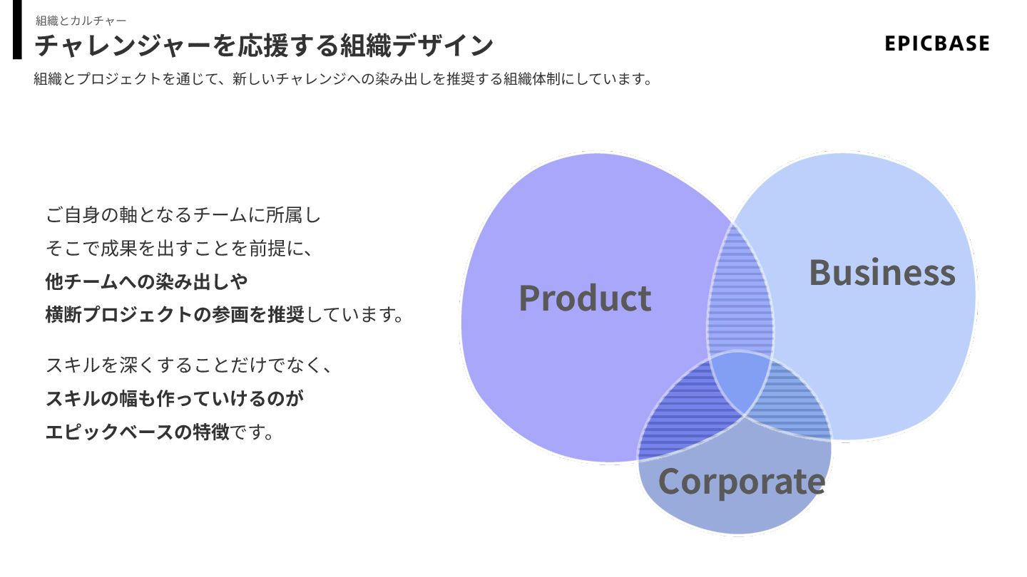 チャレンジャーを応援する組織デザイン 組織とプロジェクトを通じて、新しいチャレンジへの染み出しを推奨する組織体制にしています。 組織とカルチャー ご⾃⾝の軸となるチームに所属し そこで成果を出すことを前提に、 他チームへの染み出しや 横断プロジェクトの参画を推奨しています。 スキルを深くすることだけでなく、 スキルの幅も作っていけるのが エピックベースの特徴です。