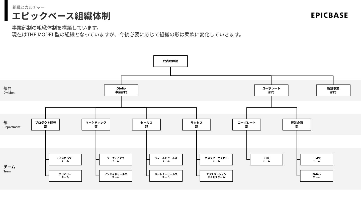 エピックベース組織体制 事業部制の組織体制を構築しています。 現在はTHE MODEL型の組織となっていますが、今後必要に応じて組織の形は柔軟に変化していきます。 組織とカルチャー チーム Team 部 Department 部⾨