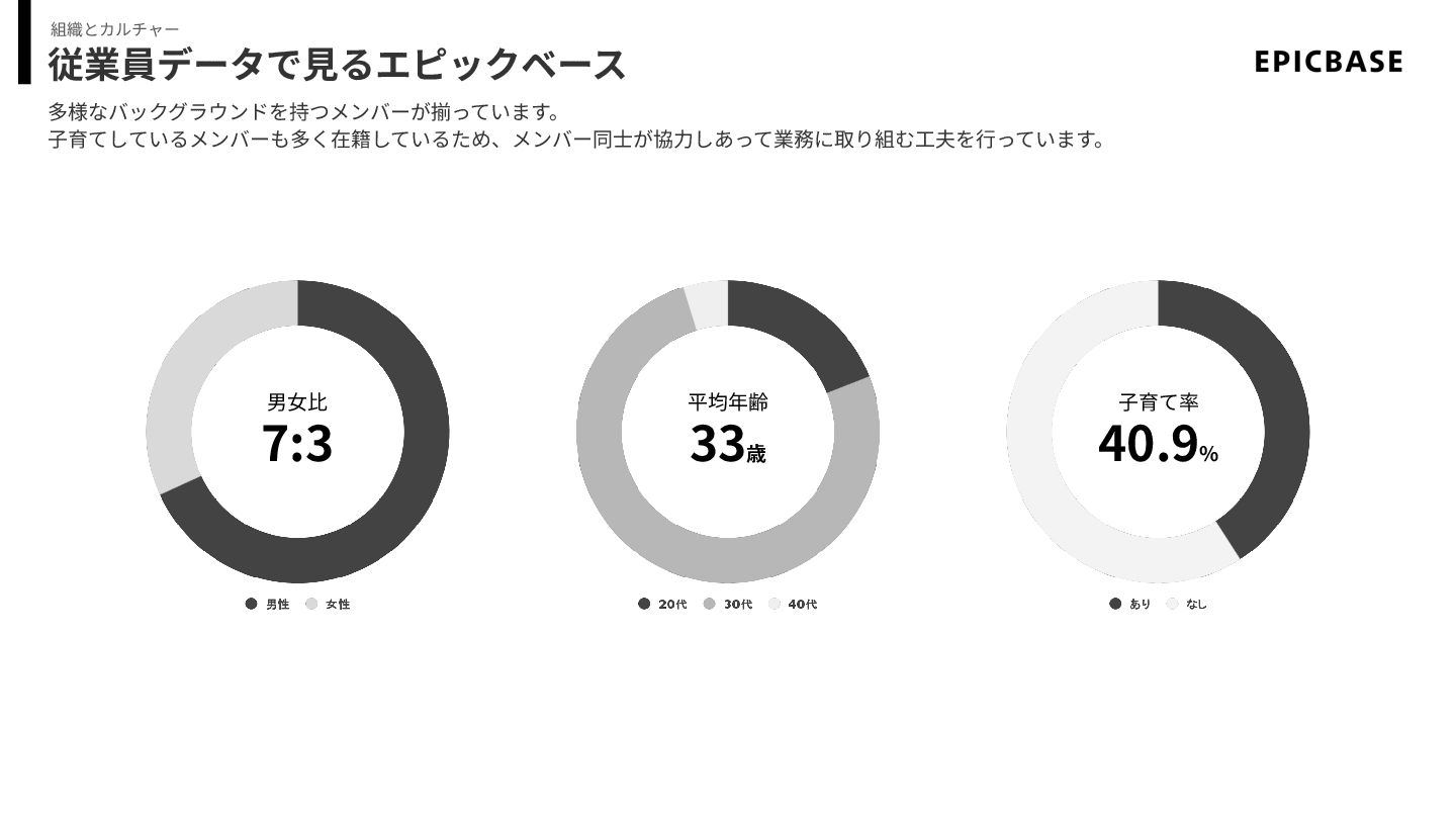 従業員データで⾒るエピックベース 多様なバックグラウンドを持つメンバーが揃っています。 ⼦育てしているメンバーも多く在籍しているため、メンバー同⼠が協⼒しあって業務に取り組む⼯夫を⾏っています。 組織とカルチャー 男⼥⽐ 7:3 平均年齢 33歳 ⼦育て率 40.9%