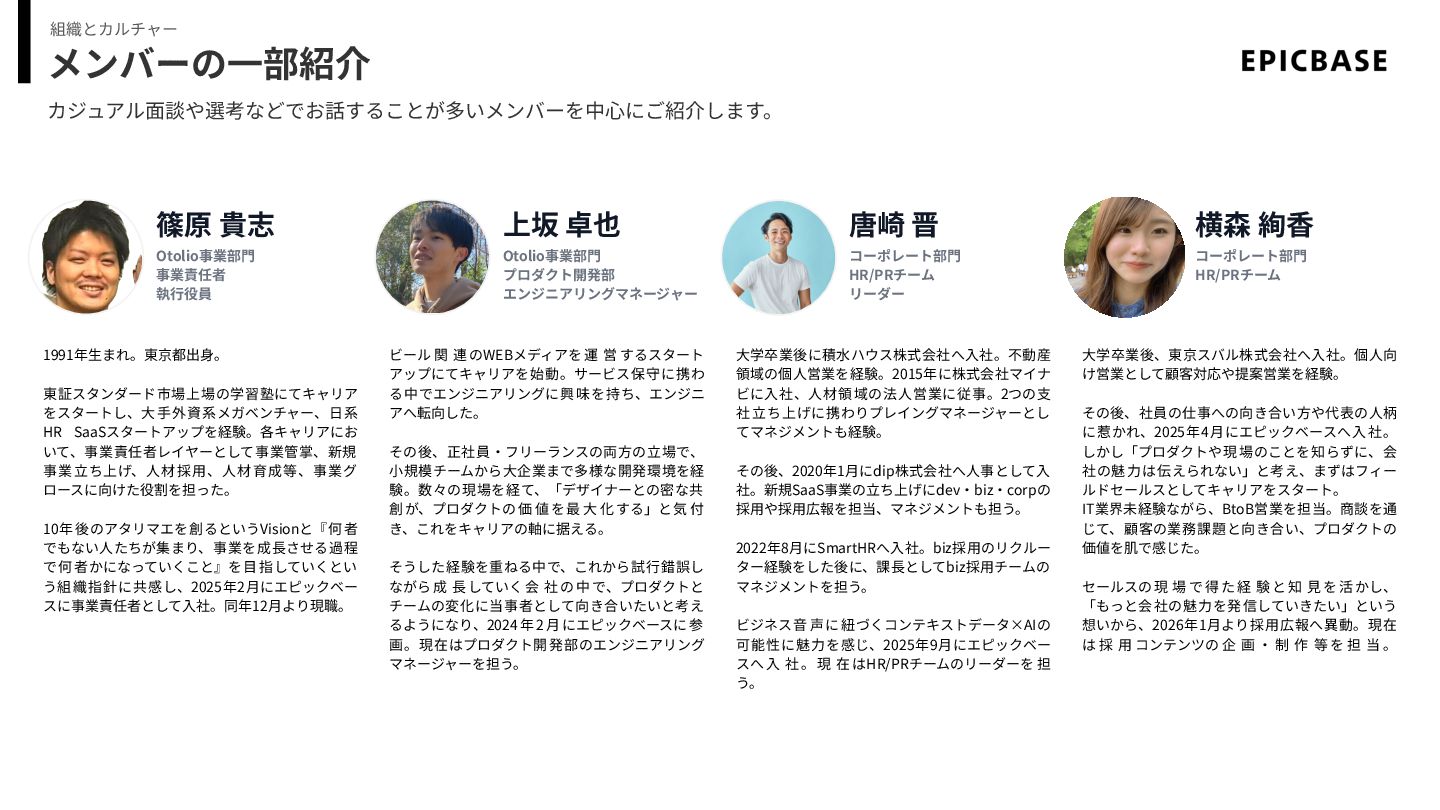 10年後のアタリマエを創るというVisionと『何者 でもない⼈たちが集まり、事業を成⻑させる過程 で何者かになっていくこと』を⽬指していくとい う組織指針に共感し、2025年2⽉にエピックベー スに事業責任者として⼊社。同年12⽉より現職。 篠原 貴志 Otolio事業部⾨ 事業責任者 執⾏役員 上坂 卓也 Otolio事業部⾨ プロダクト開発部 エンジニアリングマネージャー 唐崎 晋 コーポレート部⾨ HR/PRチーム リーダー ⼤学卒業後に積⽔ハウス株式会社へ⼊社。不動産 領域の個⼈営業を経験。2015年に株式会社マイナ ビに⼊社、⼈材領域の法⼈営業に従事。2つの⽀ 社 ⽴ち上げに携わりプレイングマネージャーとし てマネジメントも経験。 その後、2020年1⽉にdip株式会社へ⼈事として⼊ 社。新規SaaS事業の⽴ち上げにdev‧biz‧corpの 採⽤や採⽤広報を担当、マネジメントも担う。 2022年8⽉にSmartHRへ⼊社。biz採⽤のリクルー ター経験をした後に、課⻑としてbiz採⽤チームの マネジメントを担う。 ビジネス⾳ 声に紐づくコンテキストデータ×AIの 可能性に魅⼒を感じ、2025年9⽉にエピックベー スへ ⼊ 社 。 現 在 はHR/PRチームのリーダーを 担 う。 横森 絢⾹ コーポレート部⾨ HR/PRチーム ⼤学卒業後、東京スバル株式会社へ⼊社。個⼈向 け営業として顧客対応や提案営業を経験。 その後、社員の仕事への向き合い⽅や代表の⼈柄 に惹かれ、2025年4⽉にエピックベースへ⼊ 社。 しかし「プロダクトや現 場のことを知らずに、会 社の魅⼒は伝えられない」と考え、まずはフィー ルドセールスとしてキャリアをスタート。 IT業界未経験ながら、BtoB営業を担当。商談を通 じて、顧客の業務課題と向き合い、プロダクトの 価値を肌で感じた。 セールスの 現 場 で 得 た 経 験 と 知 ⾒ を 活 かし、 「もっと会社の魅⼒を発信していきたい」という 想いから、2026年1⽉より採⽤広報へ異動。現在 は 採 ⽤ コンテンツの 企 画 ‧ 制 作 等 を 担 当 。 カジュアル⾯談や選考などでお話することが多いメンバーを中⼼にご紹介します。 ビール 関 連 のWEBメディアを 運 営 するスタート アップにてキャリアを始動。サービス保守に携わ る中でエンジニアリングに興味を持ち、エンジニ アへ転向した。 その後、正社員‧フリーランスの両⽅の⽴場で、 ⼩規模チームから⼤企業まで多様な開発環境を経 験。数々の現場を経て、「デザイナーとの密な共 創が、プロダクトの価 値を最 ⼤ 化する」と気 付 き、これをキャリアの軸に据える。 そうした経験を重ねる中で、これから試⾏錯誤し ながら 成 ⻑ していく 会 社 の 中 で、プロダクトと チームの変化に当事者として向き合いたいと考え るようになり、2024 年 2 ⽉ にエピックベースに 参 画。現在はプロダクト開発部のエンジニアリング マネージャーを担う。