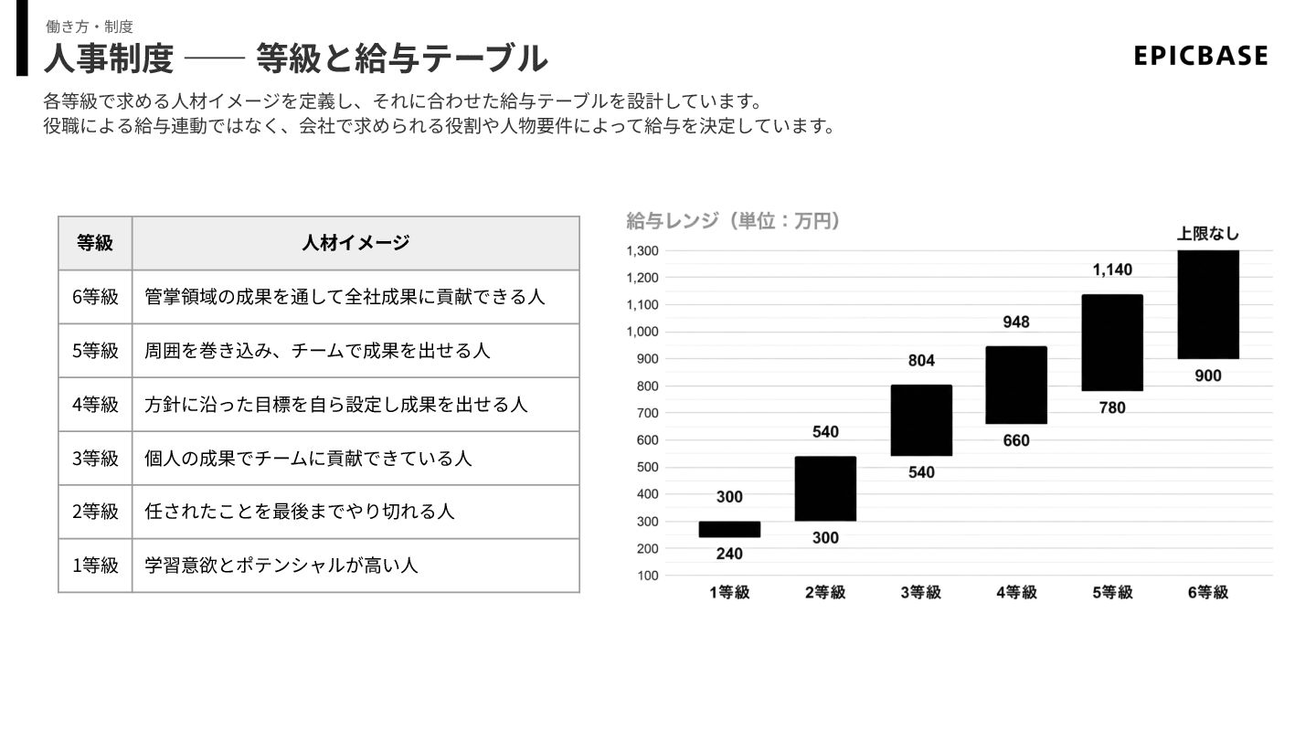 4等級 ⽅針に沿った⽬標を⾃ら設定し成果を出せる⼈ 3等級 個⼈の成果でチームに貢献できている⼈ 2等級 任されたことを最後までやり切れる⼈ 1等級 学習意欲とポテンシャルが⾼い⼈ 各等級で求める⼈材イメージを定義し、それに合わせた給与テーブルを設計しています。 役職による給与連動ではなく、会社で求められる役割や⼈物要件によって給与を決定しています。