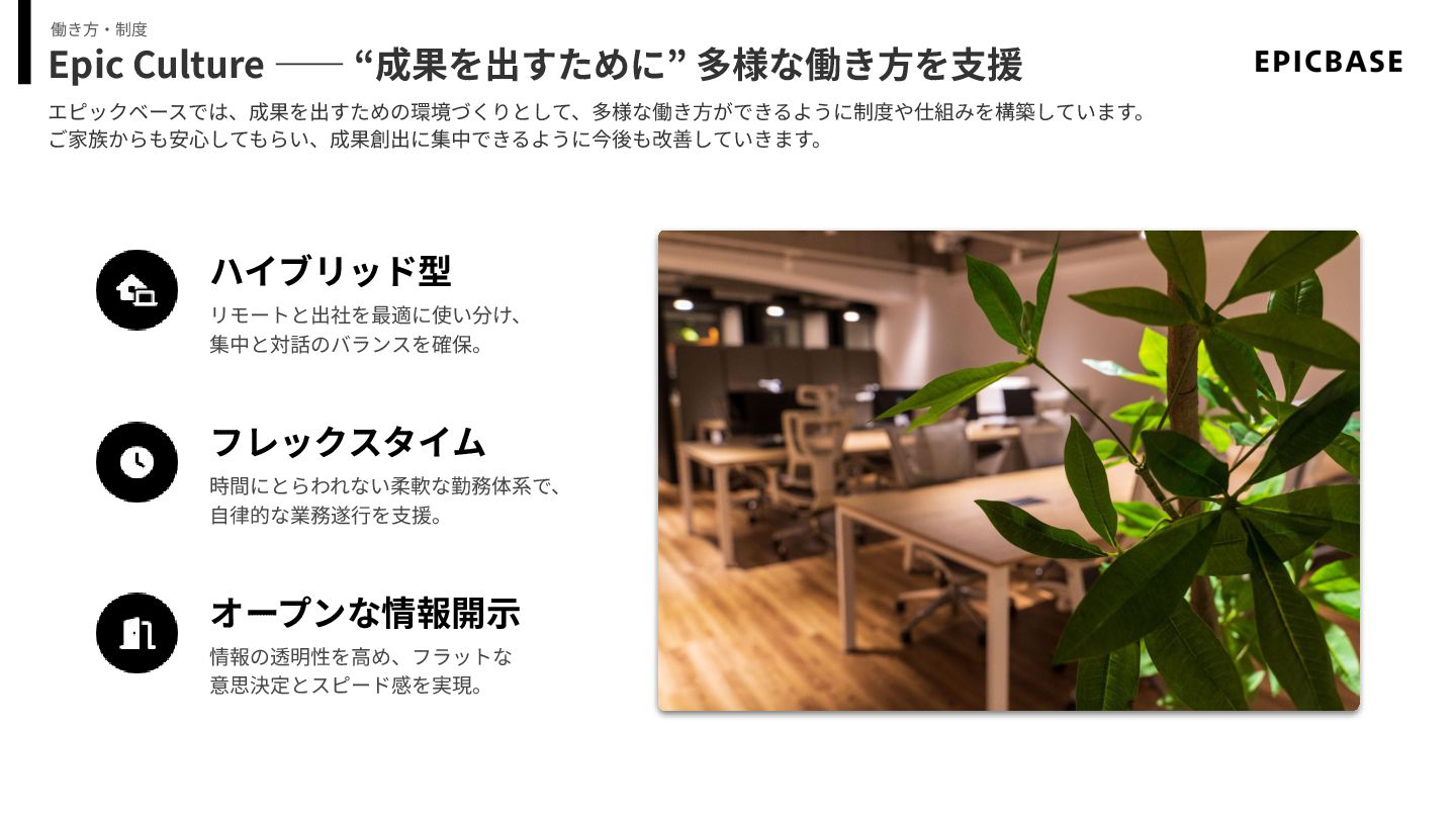 時間にとらわれない柔軟な勤務体系で、 ⾃律的な業務遂⾏を⽀援。 オープンな情報開⽰ 情報の透明性を⾼め、フラットな 意思決定とスピード感を実現。 エピックベースでは、成果を出すための環境づくりとして、多様な働き⽅ができるように制度や仕組みを構築しています。 ご家族からも安⼼してもらい、成果創出に集中できるように今後も改善していきます。