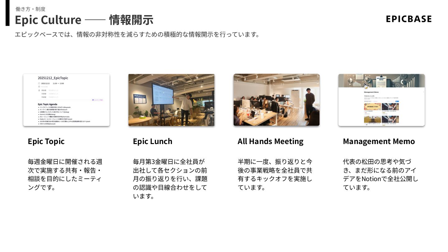 Epic Culture ―― 情報開⽰ エピックベースでは、情報の⾮対称性を減らすための積極的な情報開⽰を⾏っています。 働き⽅‧制度 Epic Topic Epic Lunch