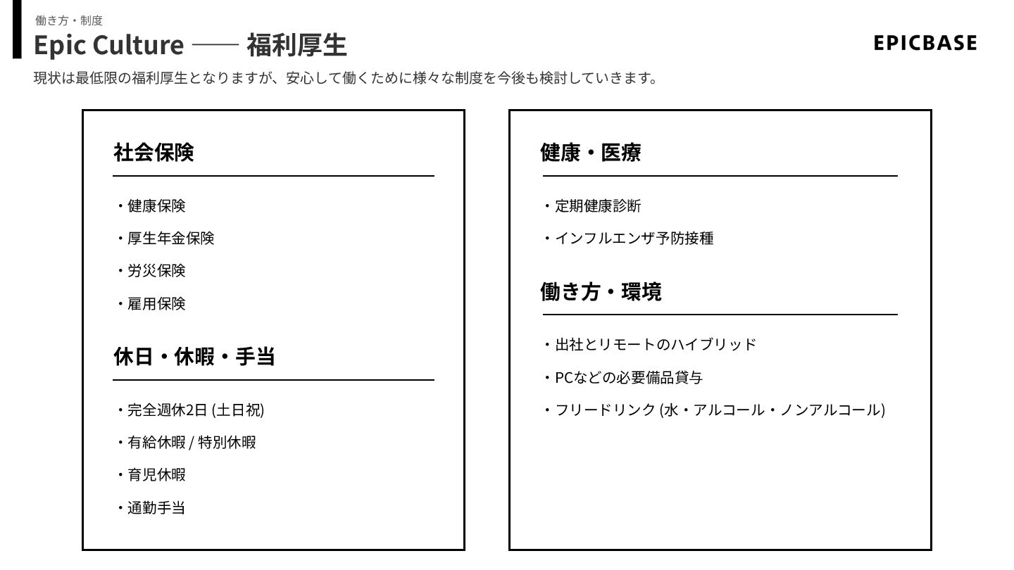 Epic Culture ―― 福利厚⽣ 現状は最低限の福利厚⽣となりますが、安⼼して働くために様々な制度を今後も検討していきます。 働き⽅‧制度 社会保険 ‧健康保険 ‧厚⽣年⾦保険 ‧労災保険