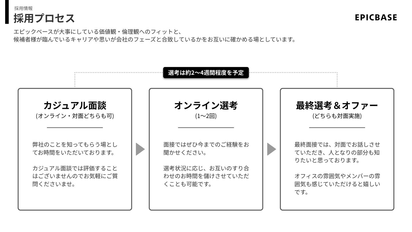 採⽤プロセス エピックベースが⼤事にしている価値観‧倫理観へのフィットと、 候補者様が臨んでいるキャリアや思いが会社のフェーズと合致しているかをお互いに確かめる場としています。 採⽤情報 カジュアル⾯談 (オンライン‧対⾯どちらも可) 弊社のことを知ってもらう場とし てお時間をいただいております。 カジュアル⾯談では評価すること はございませんのでお気軽にご質