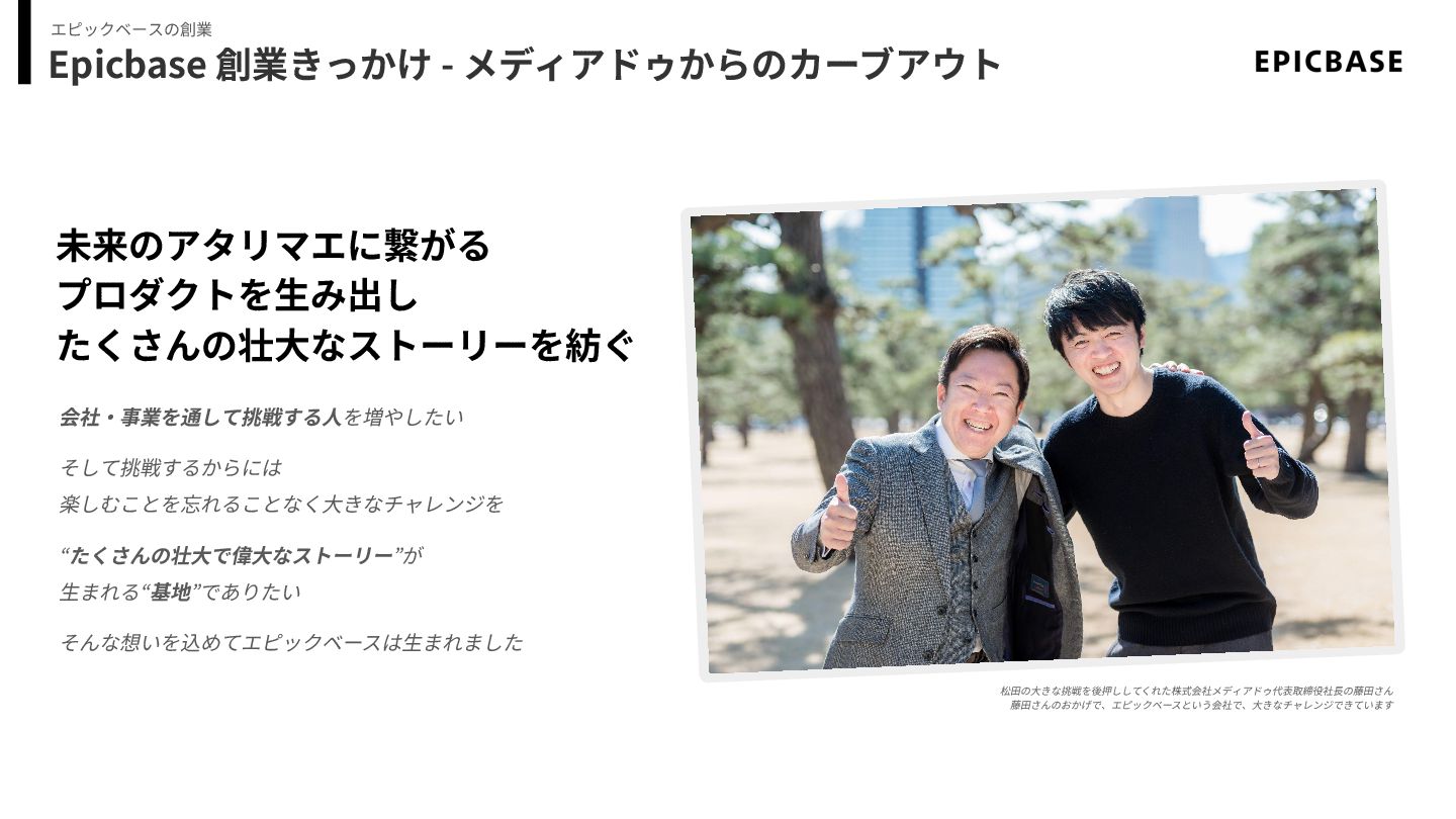 楽しむことを忘れることなく⼤きなチャレンジを “たくさんの壮⼤で偉⼤なストーリー”が ⽣まれる“基地”でありたい そんな想いを込めてエピックベースは⽣まれました 松⽥の⼤きな挑戦を後押ししてくれた株式会社メディアドゥ代表取締役社⻑の藤⽥さん 藤⽥さんのおかげで、エピックベースという会社で、⼤きなチャレンジできています