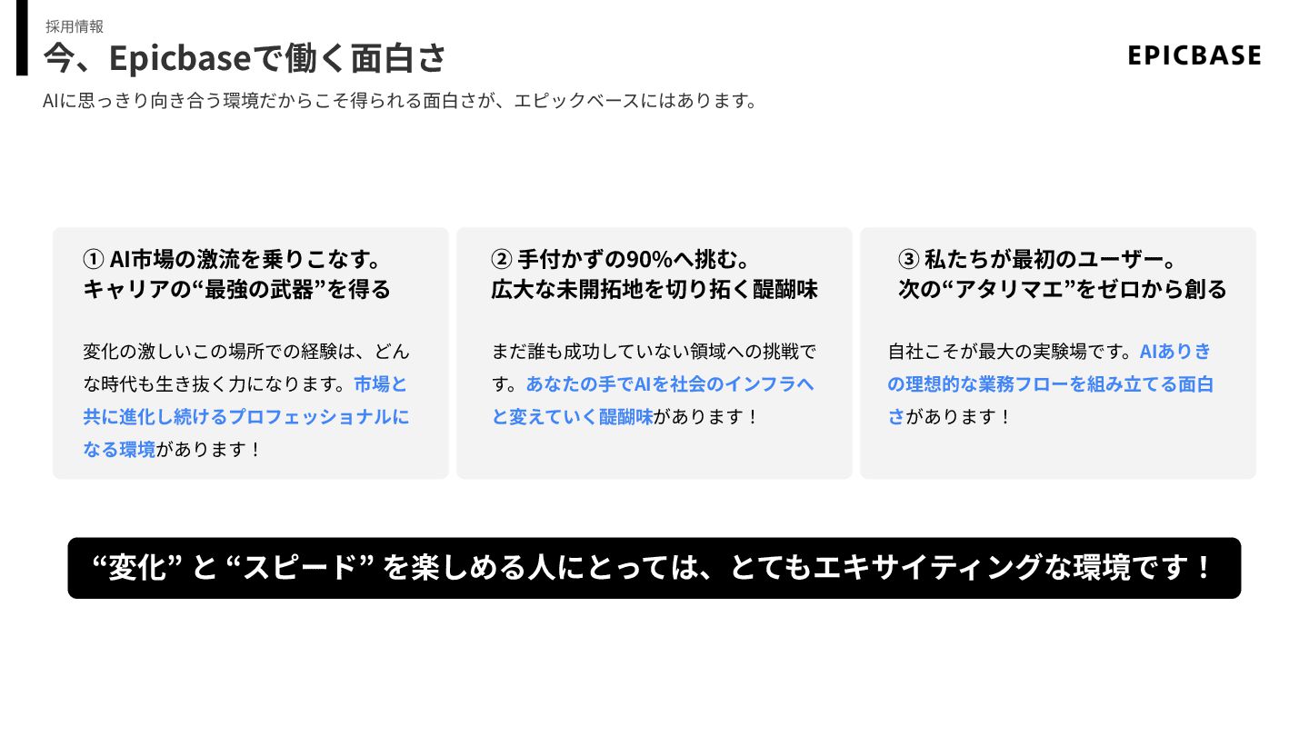 今、Epicbaseで働く⾯⽩さ AIに思っきり向き合う環境だからこそ得られる⾯⽩さが、エピックベースにはあります。 採⽤情報 ① AI市場の激流を乗りこなす。 キャリアの“最強の武器”を得る ② ⼿付かずの90%へ挑む。 広⼤な未開拓地を切り拓く醍醐味 ③