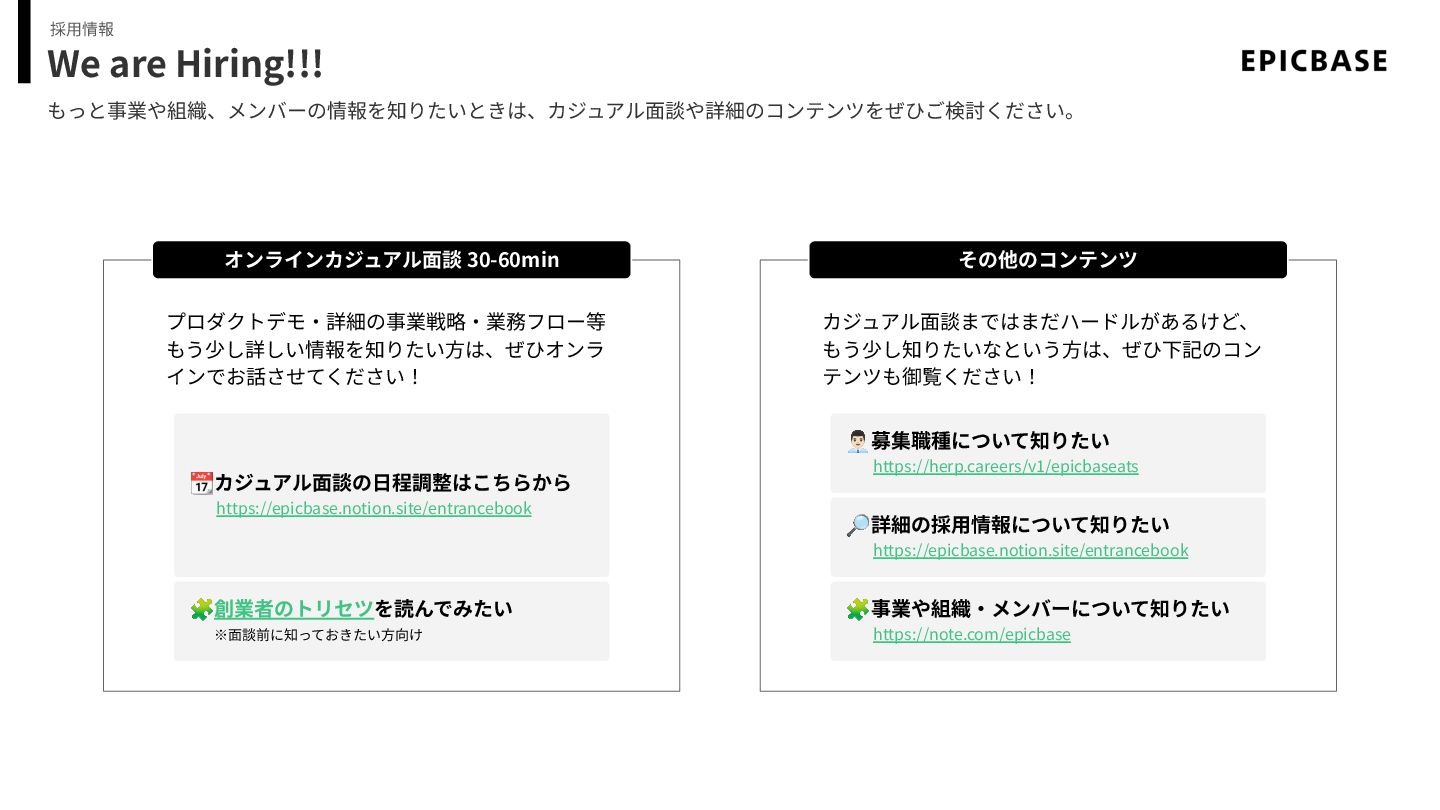 インでお話させてください! カジュアル⾯談まではまだハードルがあるけど、 もう少し知りたいなという⽅は、ぜひ下記のコン テンツも御覧ください! 募集職種について知りたい https://herp.careers/v1/epicbaseats 🔎詳細の採⽤情報について知りたい https://epicbase.notion.site/entrancebook 🧩事業や組織‧メンバーについて知りたい https://note.com/epicbase 📆カジュアル⾯談の⽇程調整はこちらから https://epicbase.notion.site/entrancebook 🧩創業者のトリセツを読んでみたい ※⾯談前に知っておきたい⽅向け