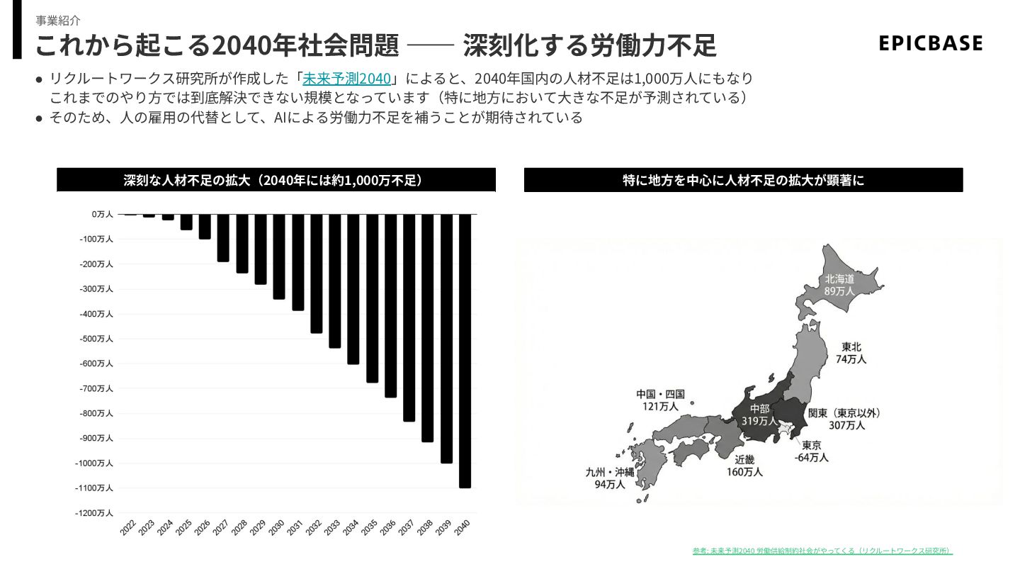 これから起こる2040年社会問題 ―― 深刻化する労働⼒不⾜ • リクルートワークス研究所が作成した「未来予測2040」によると、2040年国内の⼈材不⾜は1,000万⼈にもなり これまでのやり⽅では到底解決できない規模となっています(特に地⽅において⼤きな不⾜が予測されている) • そのため、⼈の雇⽤の代替として、AIによる労働⼒不⾜を補うことが期待されている 事業紹介 深刻な⼈材不⾜の拡⼤(2040年には約1,000万不⾜)