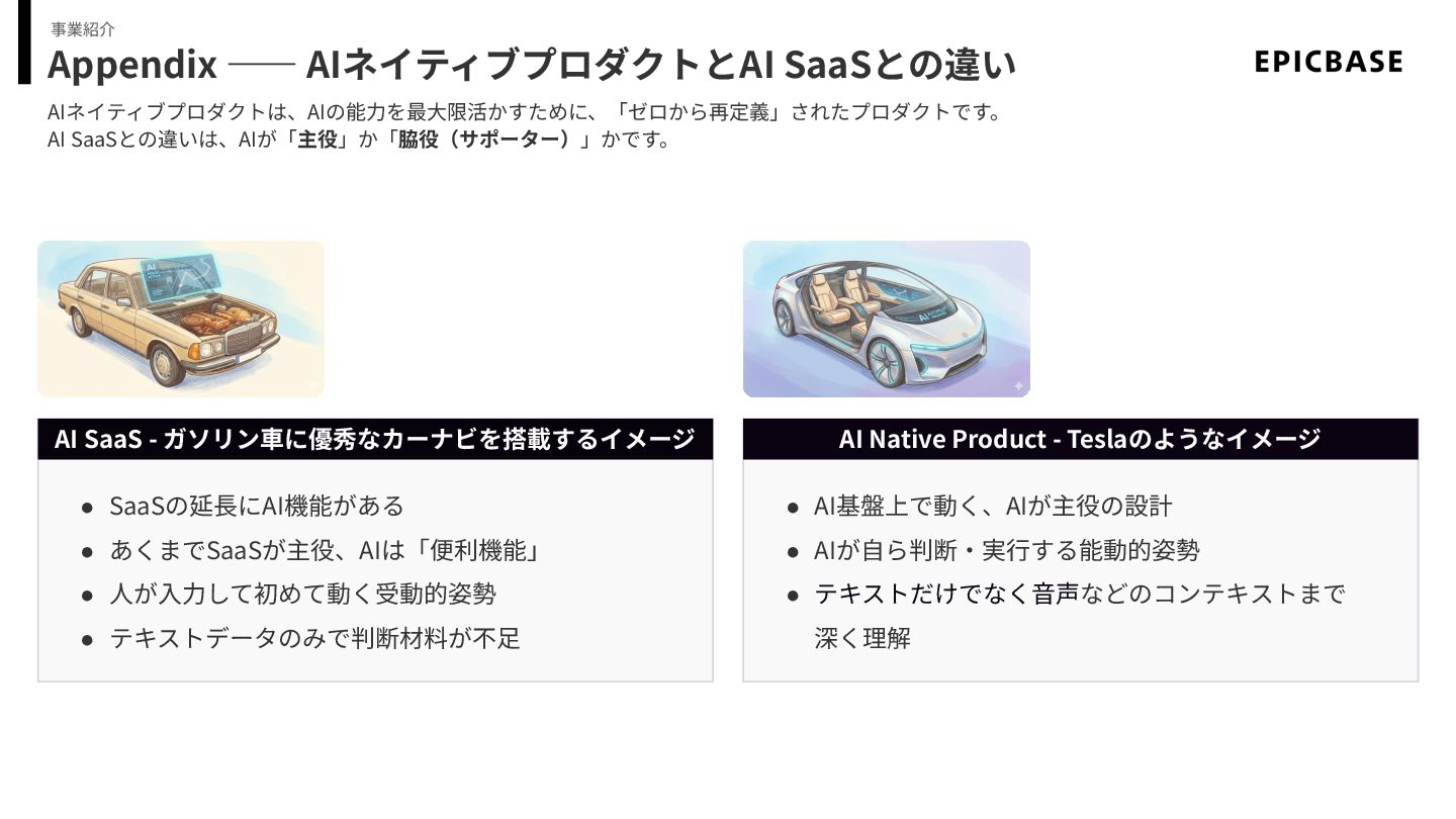 Appendix ―― AIネイティブプロダクトとAI SaaSとの違い AIネイティブプロダクトは、AIの能⼒を最⼤限活かすために、「ゼロから再定義」されたプロダクトです。 AI SaaSとの違いは、AIが「主役」か「脇役(サポーター)」かです。 事業紹介 AI SaaS