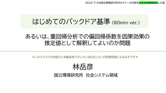 2024年7月2日に国立環境研究所で行ったセミナーのスライドの増補改訂版です。統計的因果推論における最重要概念の1つであるバックドア基準についての解説スライドです。