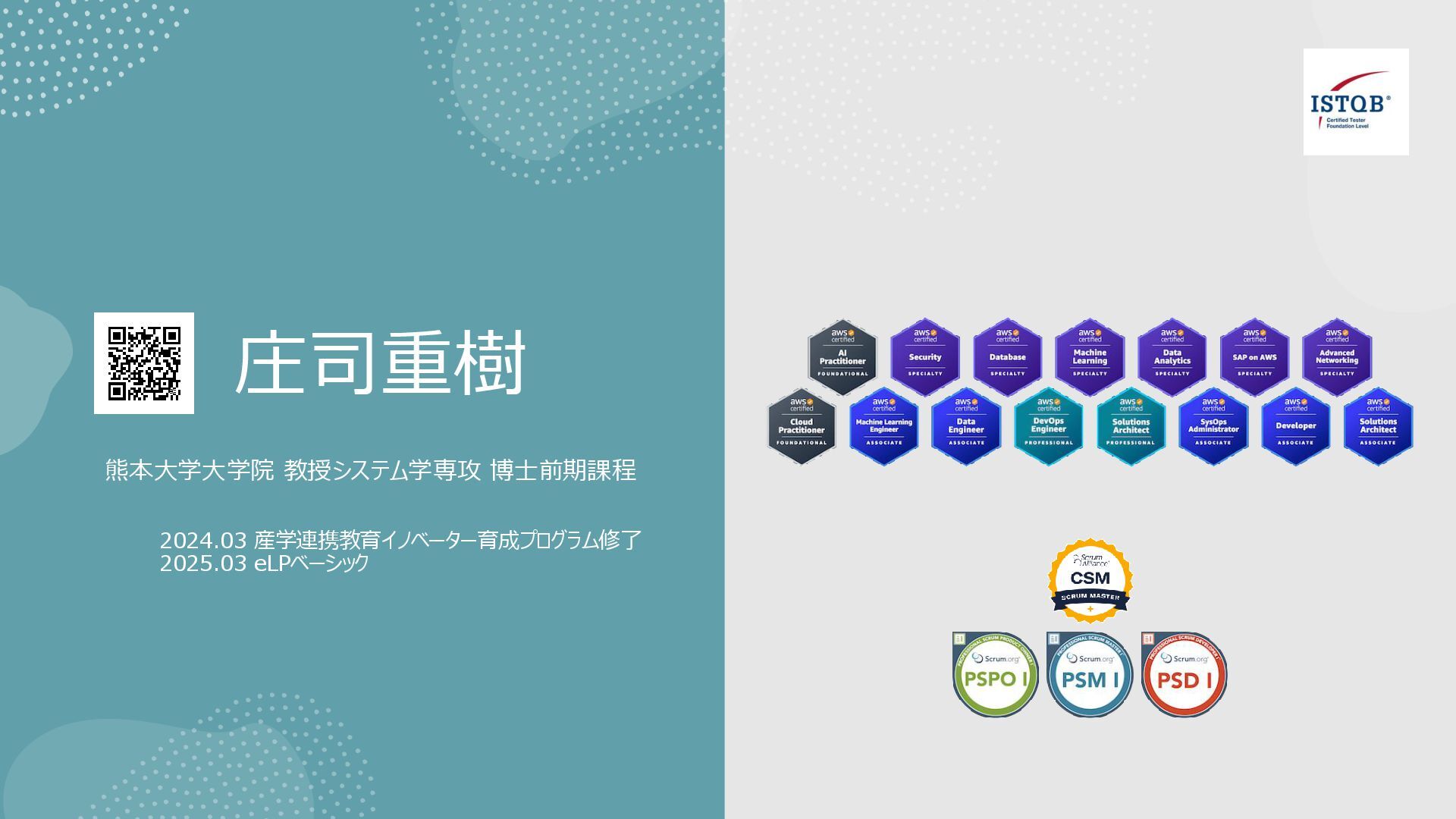 庄司重樹 熊本大学大学院 教授システム学専攻 博士前期課程 2024.03 産学連携教育イノベーター育成プログラム修了 2025.03 eLPベーシック
