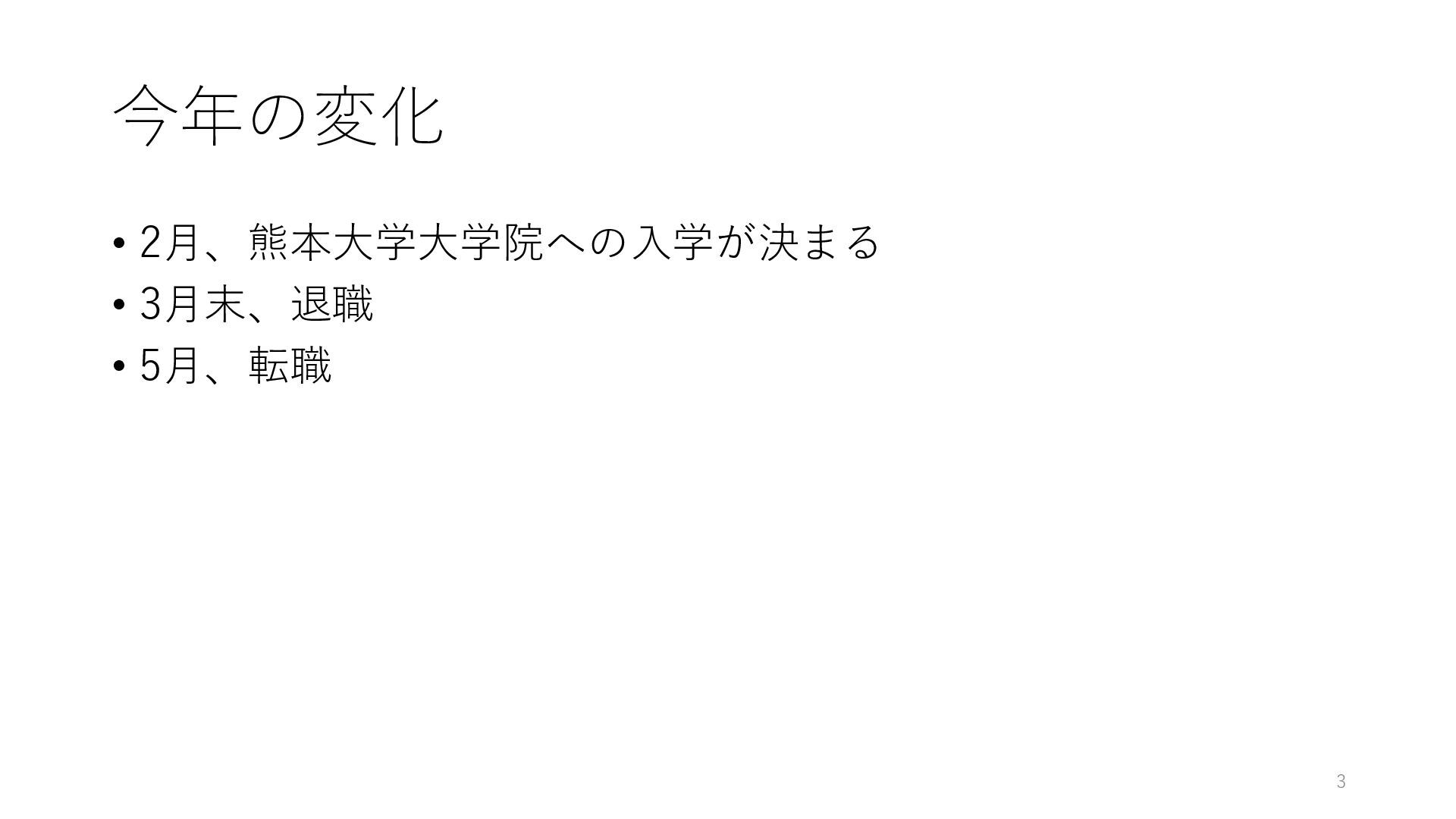 今年の変化 • 2月、熊本大学大学院への入学が決まる • 3月末、退職 • 5月、転職 3