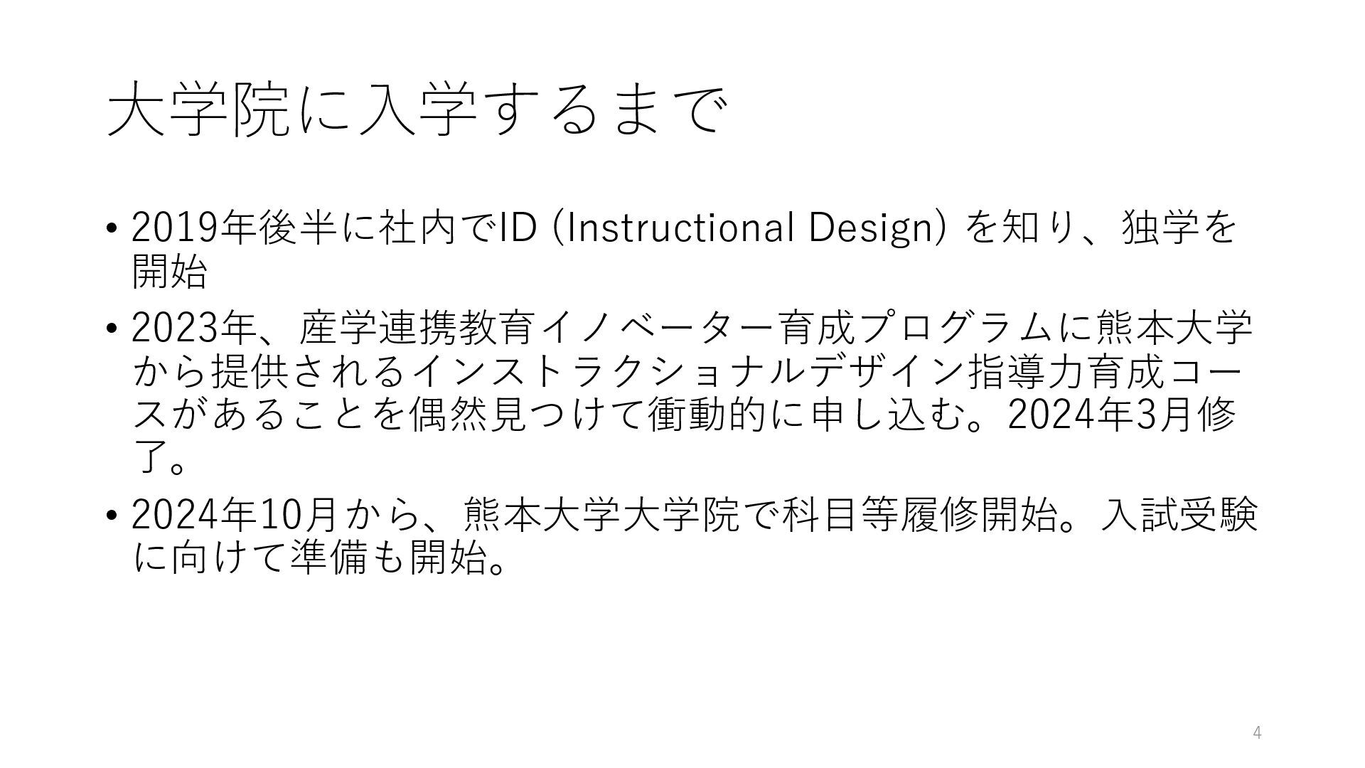 大学院に入学するまで • 2019年後半に社内でID (Instructional Design) を知り、独学を 開始 • 2023年、産学連携教育イノベーター育成プログラムに熊本大学 から提供されるインストラクショナルデザイン指導力育成コー