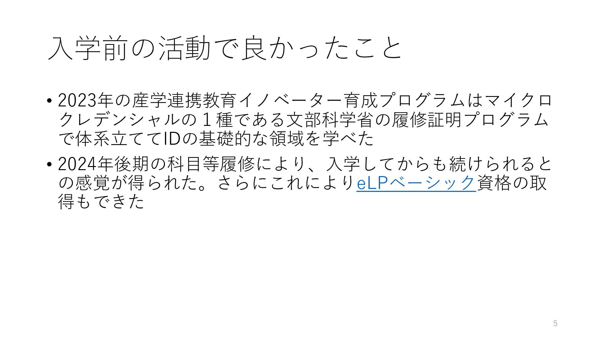 入学前の活動で良かったこと • 2023年の産学連携教育イノベーター育成プログラムはマイクロ クレデンシャルの1種である文部科学省の履修証明プログラム で体系立ててIDの基礎的な領域を学べた • 2024年後期の科目等履修により、入学してからも続けられると の感覚が得られた。さらにこれによりeLPベーシック資格の取 得もできた 5