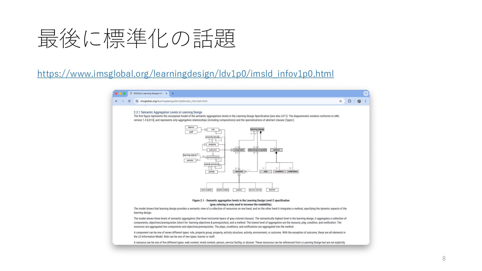 最後に標準化の話題 8 https://www.imsglobal.org/learningdesign/ldv1p0/imsld_infov1p0.html