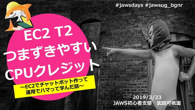 セッションターゲット ・AWS触ったことがない ・AWS始めようと思っている方 ・「T2インスタンス」のTとか2って何だろうって方 ・AWSの設計・構築・保守に携わる方 #jawsdays #jawsug_bgnr