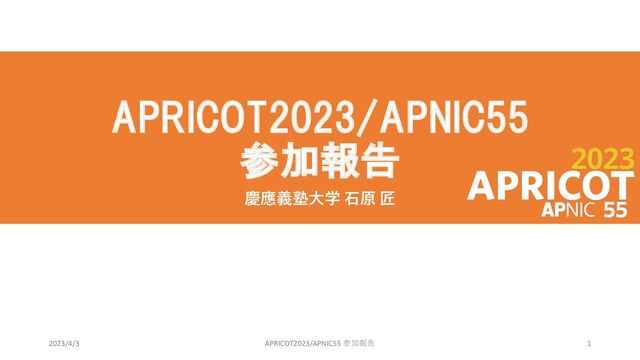 APRICOT2023/APNIC55 参加報告 慶應義塾⼤学 ⽯原 匠 2023/4/3 APRICOT2023/APNIC55 参加報告 1