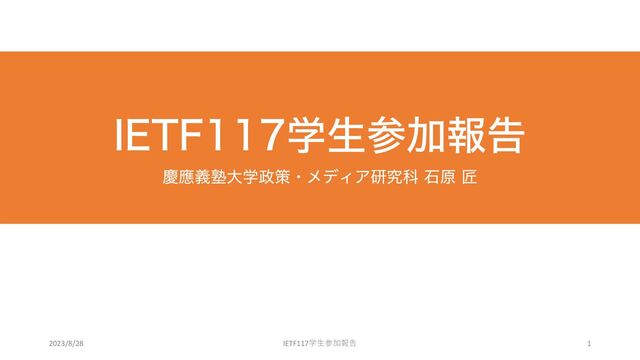 *&5'ֶੜࢀՃใࠂ ܚጯٛक़େֶࡦɾϝσΟΞݚڀՊ ੴݪ ঊ 2023/8/28 IETF117学⽣参加報告 1