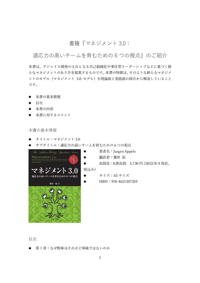 1 書籍『マネジメント 3.0: 適応力の高いチームを育むための 6 つの視点』のご紹介 本書は、アジャイル開発の土台となる自己組織化や奉仕型リーダーシップなどに基づく新 たなマネジメントのあり方を提案するものです。 本書の特徴は、 そのような新たなマネジメ