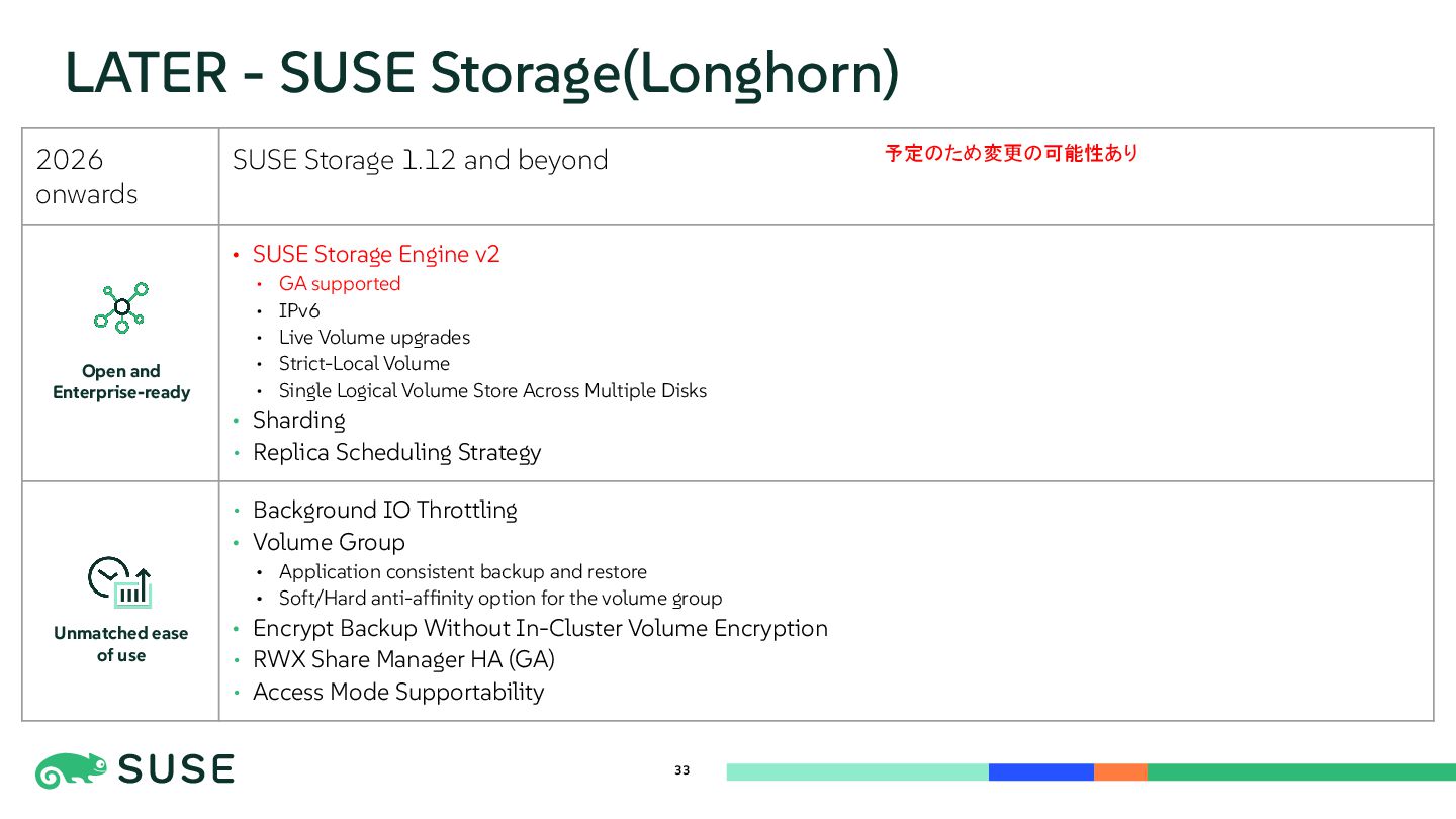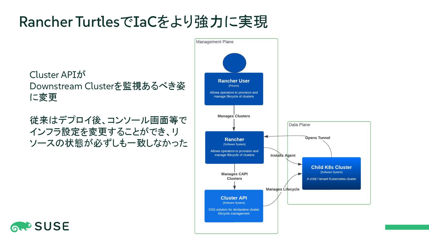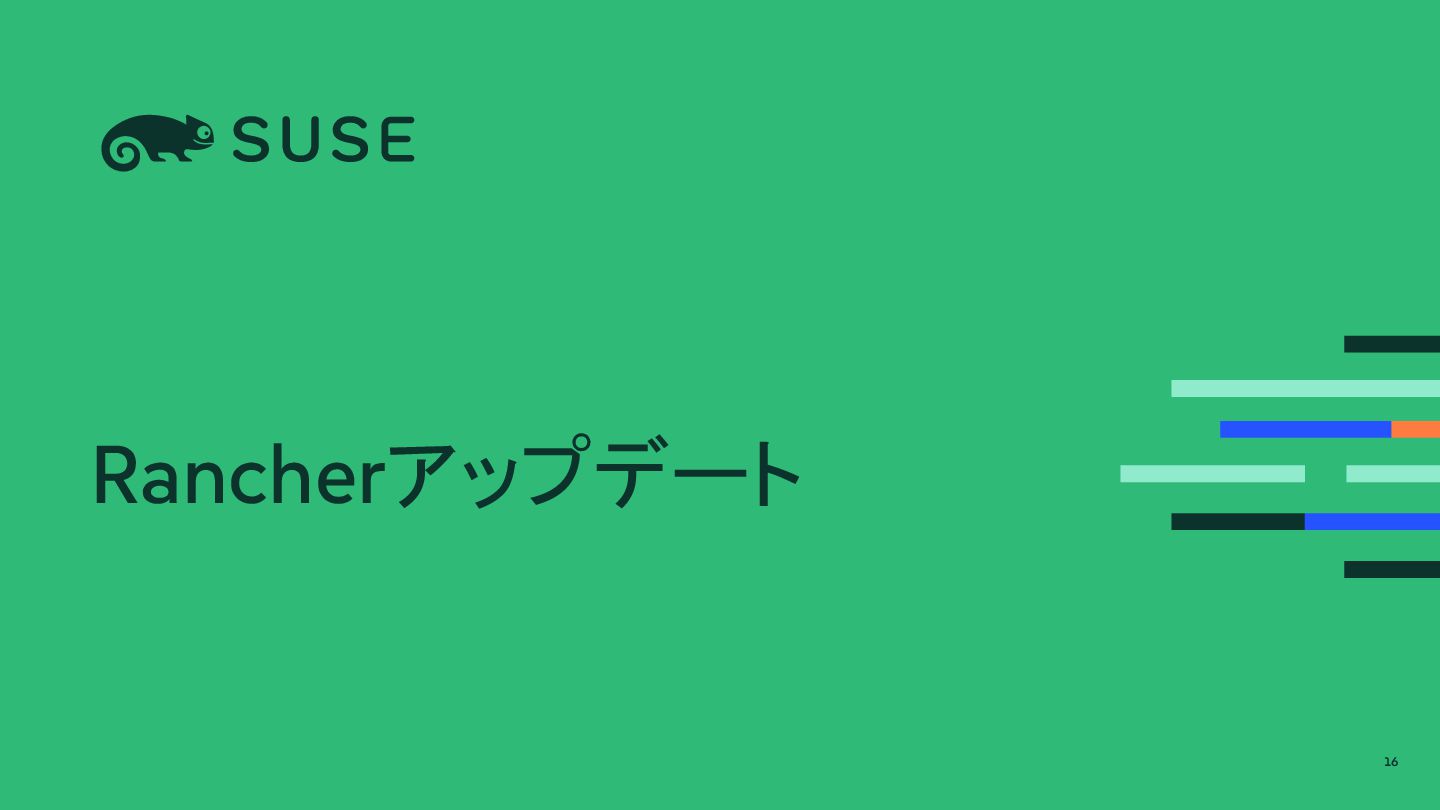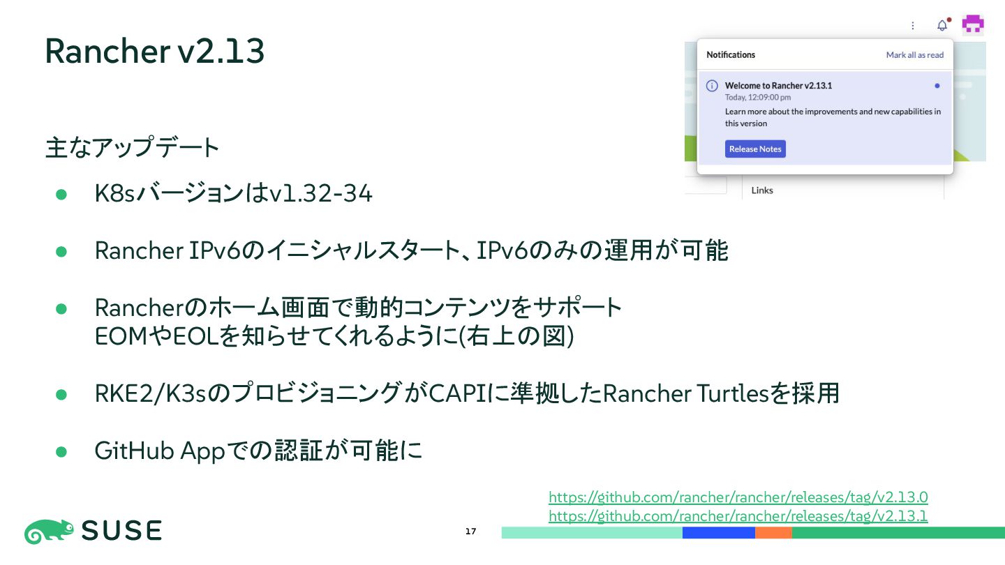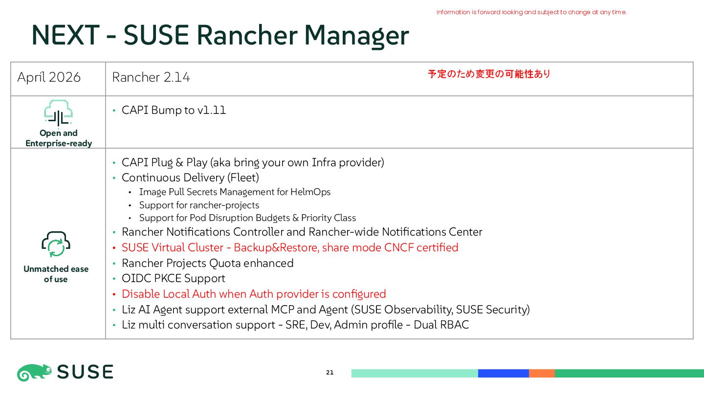 • CAPI Bump to v1.11 • CAPI Plug & Play (aka bring your own Infra provider) • Continuous Delivery (Fleet) • Image Pull Secrets Management for HelmOps • Support for rancher-projects • Support for Pod Disruption Budgets & Priority Class • Rancher Notifications Controller and Rancher-wide Notifications Center • SUSE Virtual Cluster - Backup&Restore, share mode CNCF certified • Rancher Projects Quota enhanced • OIDC PKCE Support • Disable Local Auth when Auth provider is configured • Liz AI Agent support external MCP and Agent (SUSE Observability, SUSE Security) • Liz multi conversation support - SRE, Dev, Admin profile - Dual RBAC Information is forward looking and subject to change at any time. Unmatched ease of use Open and Enterprise-ready 予定のため変更の可能性あり