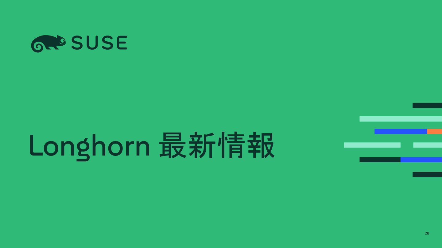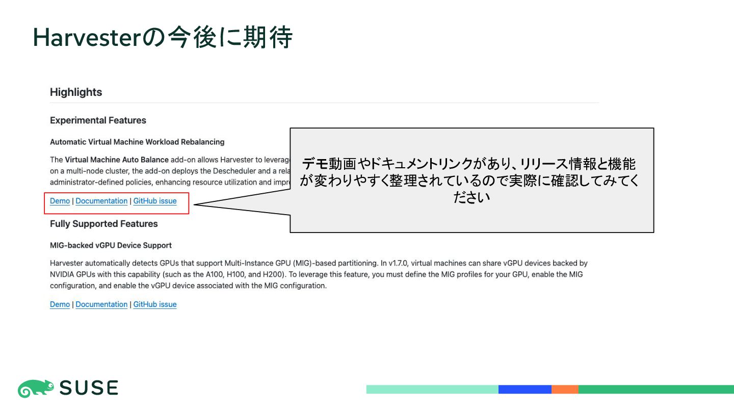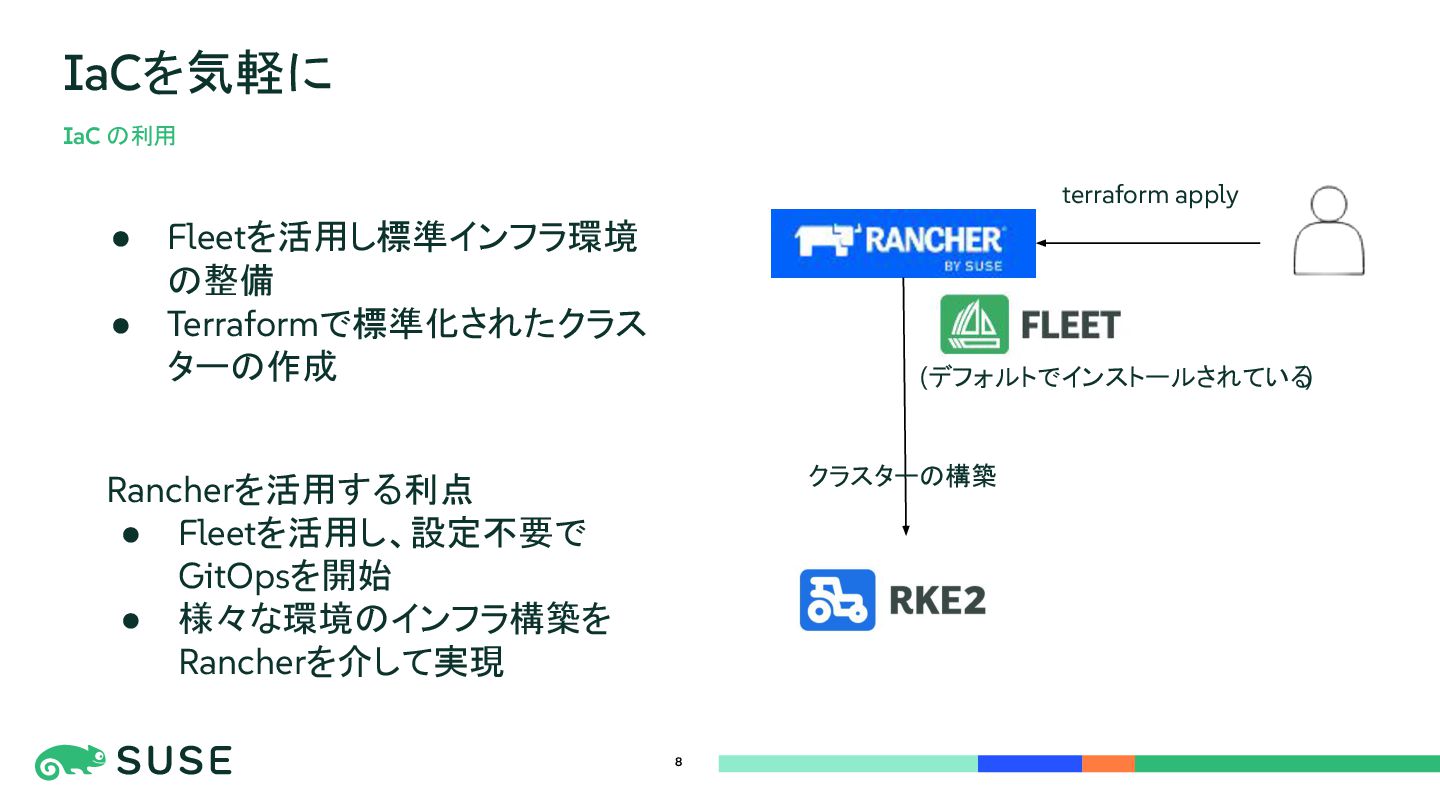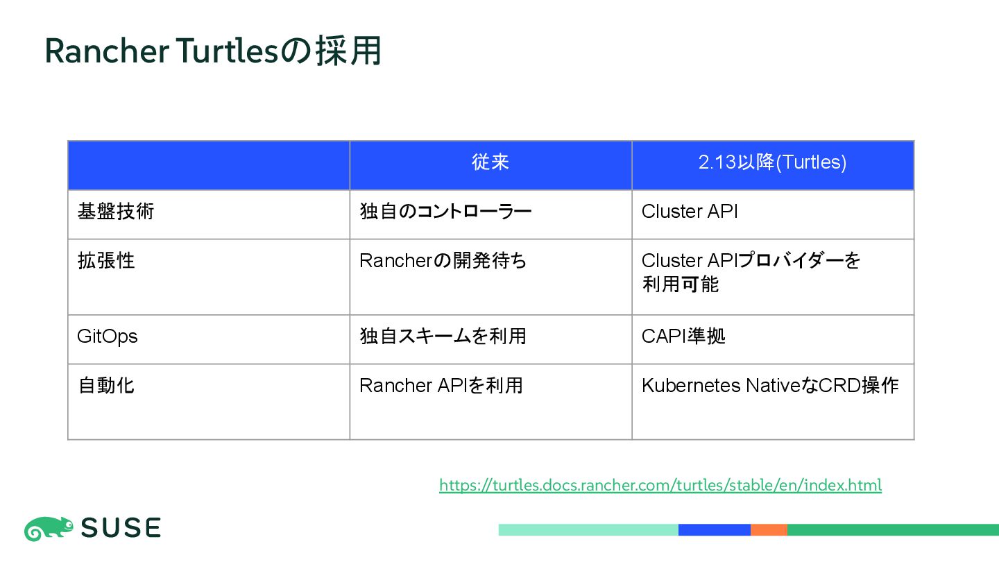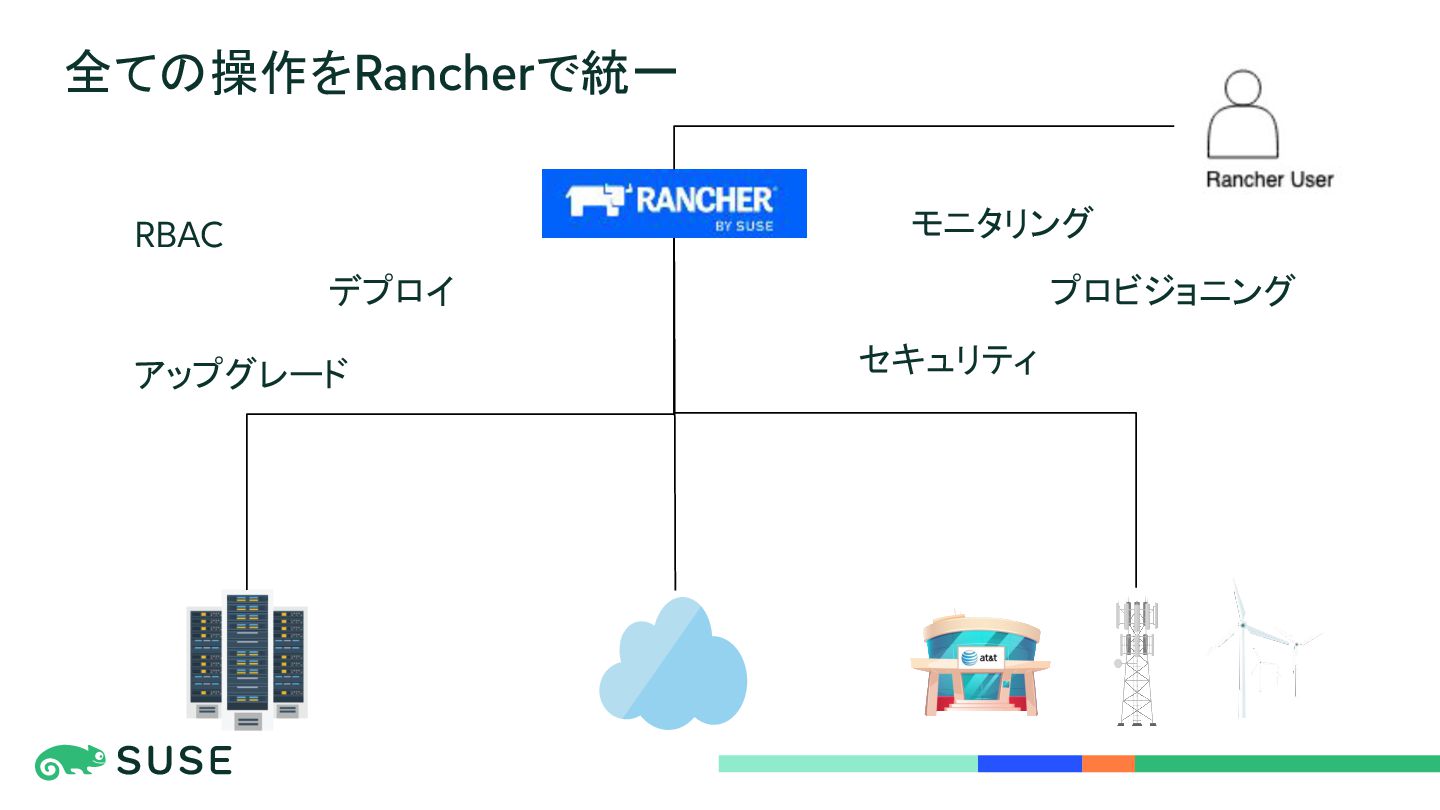 • CAPI Bump to v1.11 • CAPI Plug & Play (aka bring your own Infra provider) • Continuous Delivery (Fleet) • Image Pull Secrets Management for HelmOps • Support for rancher-projects • Support for Pod Disruption Budgets & Priority Class • Rancher Notifications Controller and Rancher-wide Notifications Center • SUSE Virtual Cluster - Backup&Restore, share mode CNCF certified • Rancher Projects Quota enhanced • OIDC PKCE Support • Disable Local Auth when Auth provider is configured • Liz AI Agent support external MCP and Agent (SUSE Observability, SUSE Security) • Liz multi conversation support - SRE, Dev, Admin profile - Dual RBAC Information is forward looking and subject to change at any time. Unmatched ease of use Open and Enterprise-ready 予定のため変更の可能性あり