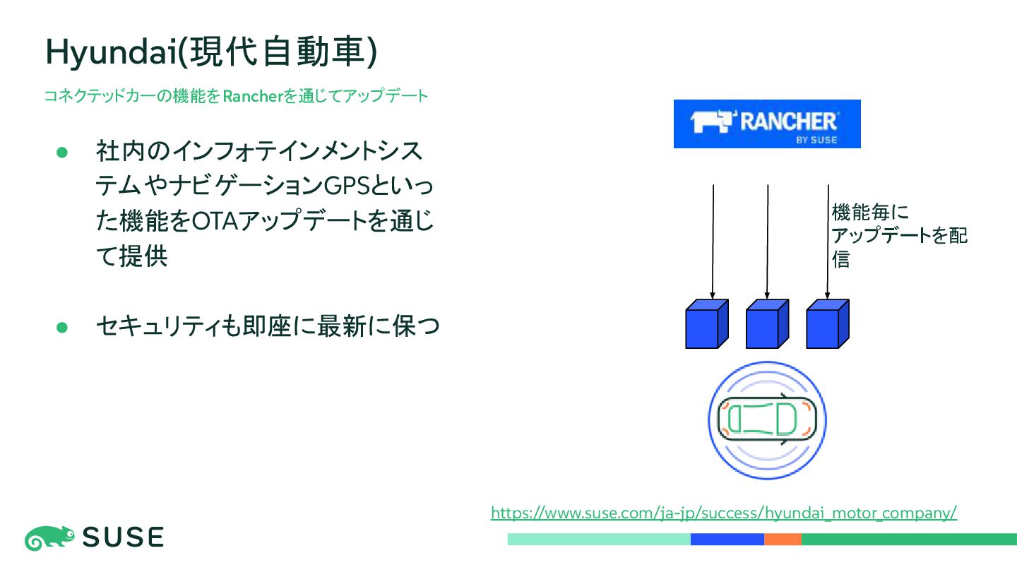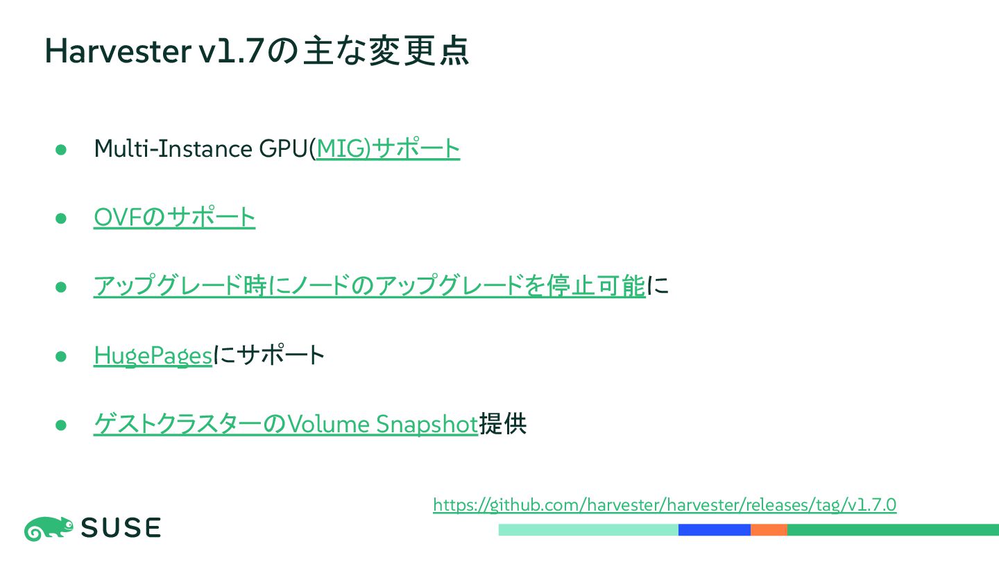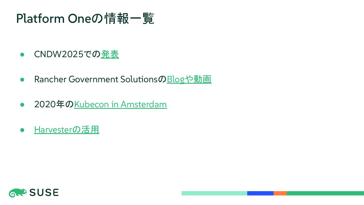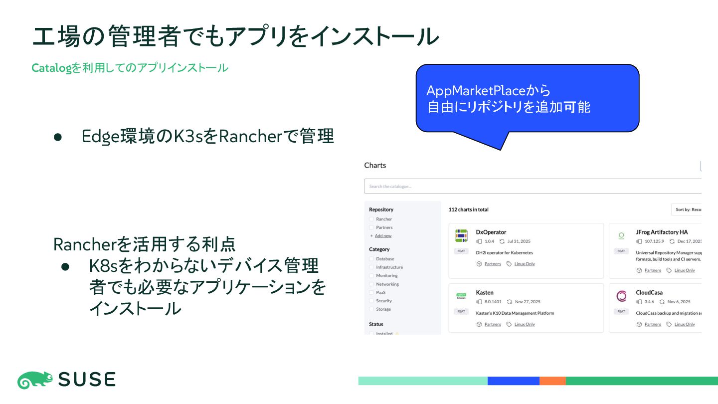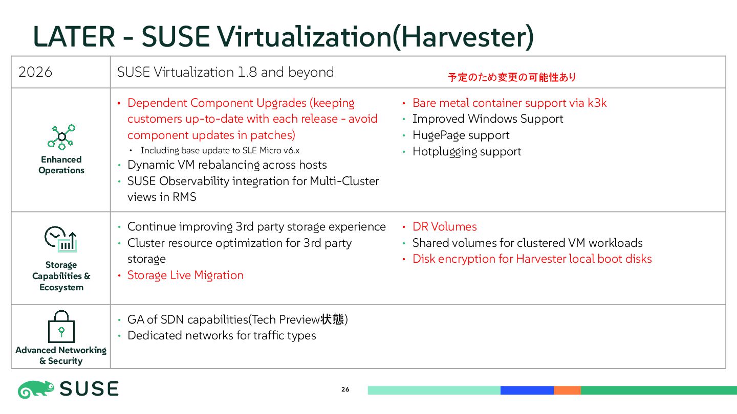 • CAPI Bump to v1.11 • CAPI Plug & Play (aka bring your own Infra provider) • Continuous Delivery (Fleet) • Image Pull Secrets Management for HelmOps • Support for rancher-projects • Support for Pod Disruption Budgets & Priority Class • Rancher Notifications Controller and Rancher-wide Notifications Center • SUSE Virtual Cluster - Backup&Restore, share mode CNCF certified • Rancher Projects Quota enhanced • OIDC PKCE Support • Disable Local Auth when Auth provider is configured • Liz AI Agent support external MCP and Agent (SUSE Observability, SUSE Security) • Liz multi conversation support - SRE, Dev, Admin profile - Dual RBAC Information is forward looking and subject to change at any time. Unmatched ease of use Open and Enterprise-ready 予定のため変更の可能性あり