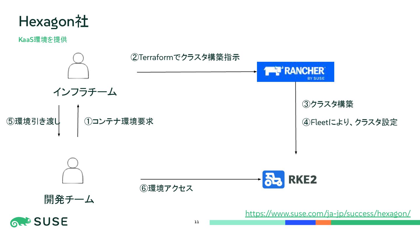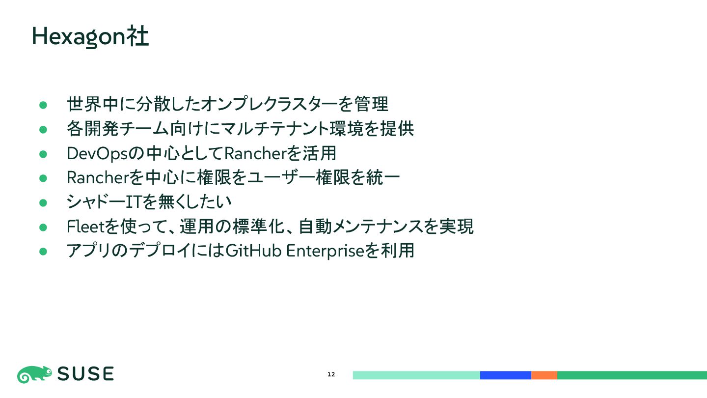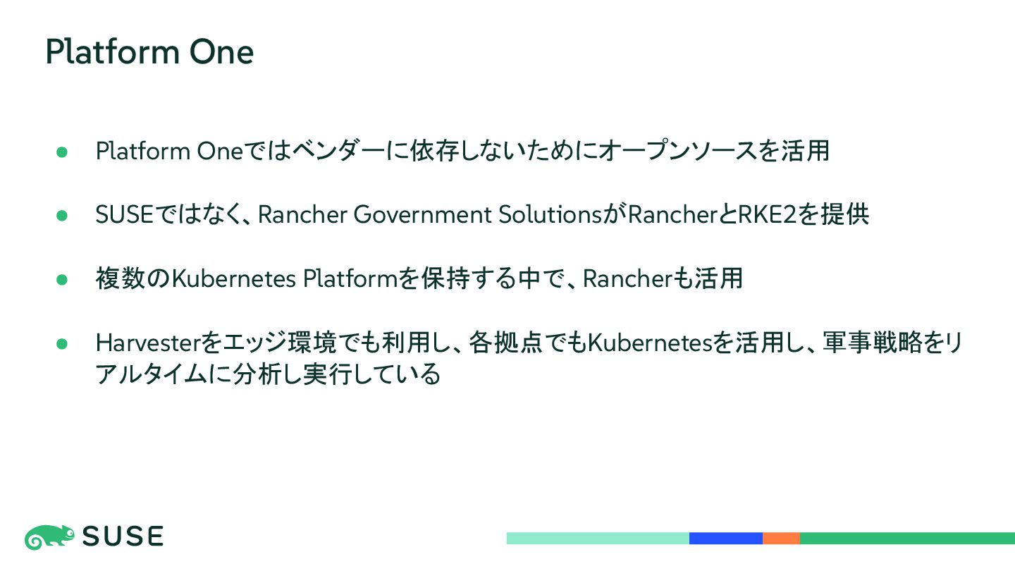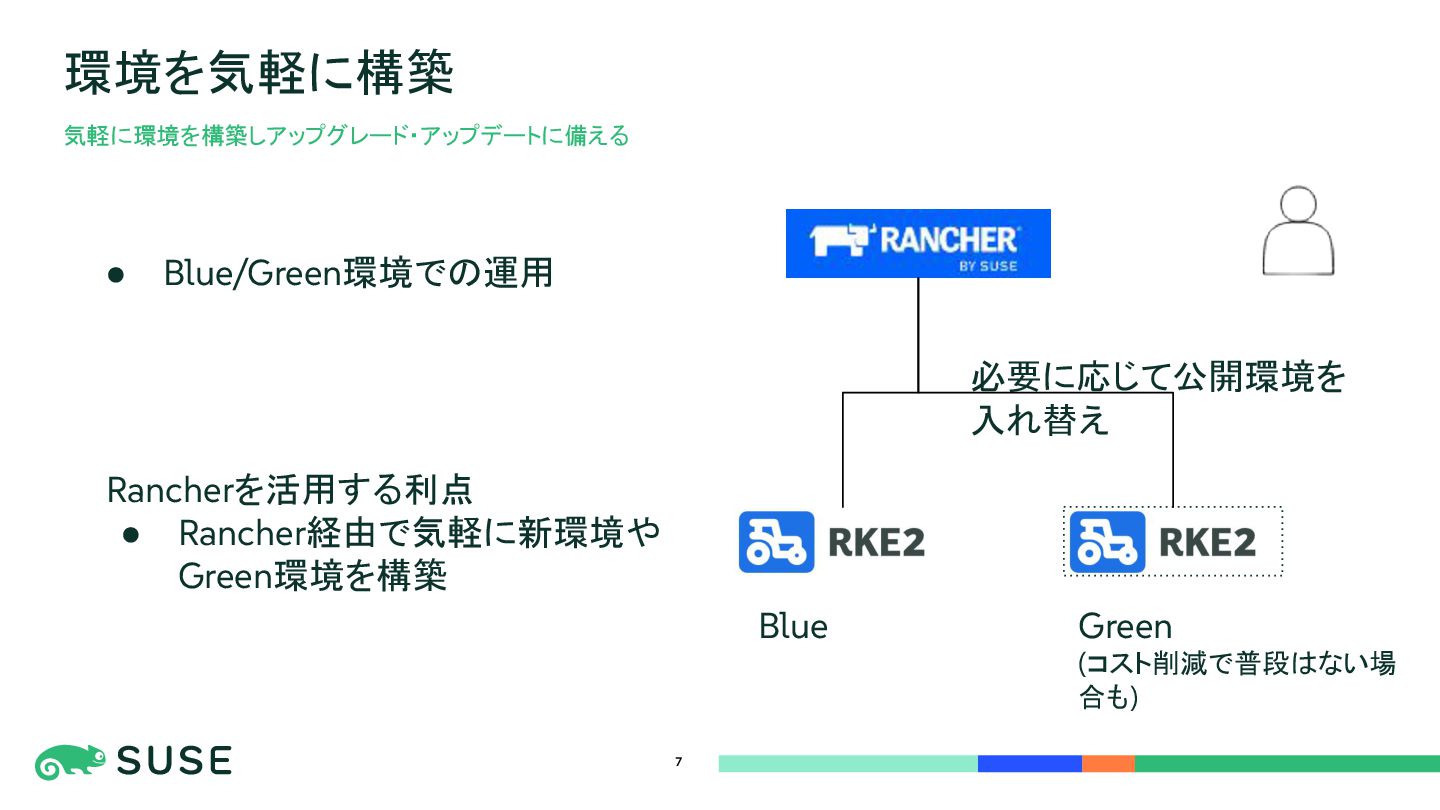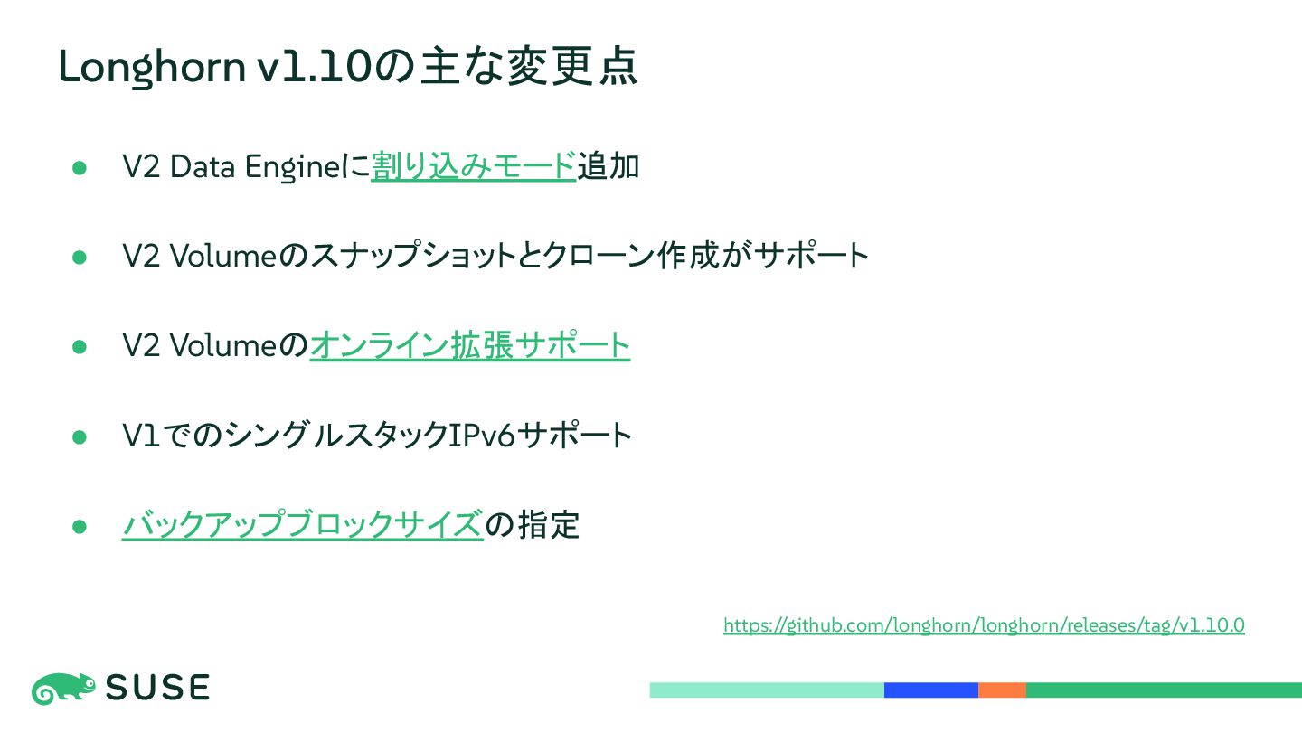 • CAPI Bump to v1.11 • CAPI Plug & Play (aka bring your own Infra provider) • Continuous Delivery (Fleet) • Image Pull Secrets Management for HelmOps • Support for rancher-projects • Support for Pod Disruption Budgets & Priority Class • Rancher Notifications Controller and Rancher-wide Notifications Center • SUSE Virtual Cluster - Backup&Restore, share mode CNCF certified • Rancher Projects Quota enhanced • OIDC PKCE Support • Disable Local Auth when Auth provider is configured • Liz AI Agent support external MCP and Agent (SUSE Observability, SUSE Security) • Liz multi conversation support - SRE, Dev, Admin profile - Dual RBAC Information is forward looking and subject to change at any time. Unmatched ease of use Open and Enterprise-ready 予定のため変更の可能性あり