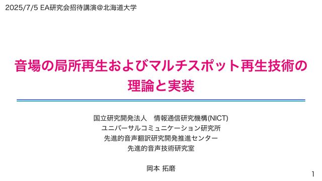 [dB] 1.5 2 2.5 y [m] -2 -1.5 -1 -0.5 0 0.5 1 1.5 2 x [m] -30 -25 -20 -15 -10 -5 0 [dB] z = 0 [m] X axis [m] -1 0 1 Y axis [m] -1.5 -1 -0.5 0 0.5 1 1.5 -40 -30 -20 -10 0 Y axis [m] X axis [m] z = 0 [m] [dB] −2 −1 0 1 2 −2 −1.5 −1 −0.5 0 0.5 1 1.5 2 −40 −35 −30 −25 −20 −15 −10 −5 0 z = 0 [m] [dB] -1 0 1 2 3 4 y [m] -2 -1 0 1 2 x [m] -40 -35 -30 -25 -20 -15 -10 -5 0 *$"441 +"4" *$"441 +*).41 8"41"" +*).41 *8"&/$ 8"41"" *$"441 Quiet zone Listening zone rq rq rb r1 r2 ro ri *$"441 Reproduced sound field and reproduction error Sound field represented by angular spectrum coefficients Sound field recorded by linear receiver (Spatial Fourier transform) 2.5D HOA for circular secondary sources (J. Ahrens et al. 2008.) Analytical driving function of 2.5D synthesis Analytical approaches to sound field recording and reproduction Analytical conversion of sound field representation Analytical driving function of 2.5D synthesis for circular secondary sources Sound field recorded by linear microphone arrays can be reproduced by circular loudspeaker arrays 2.5D higher-order Ambisonics for a sound field described by angular spectrum coefficients Takuma OKAMOTO, National Institute of Information and Communication Technology, Japan 1. Introduction 2. Analytical conversion of sound field representation 3. Proposed formulation 4. Computer simulations Reproduction error Sound field Lmic = Lsp = 64 ch, x = 0.05 m, r0 = 2.0 m, xs = [1, 5, 0]T ˜ P( k, !) = ˜ P(kx, !) = Z 1 1 P(x, 0, !)ejkxxdx = Z 1 1 P(x, 0, !)ejk cos( k)xdx ˚ D2.5D,m(r0, !) = ( j)|m| 1 ⇡r0h(2) |m| (kr0) Z ⇡ 0 ˜ P( k, !) sin( k)e jm k d k ˚ D2.5D,m(r = 0, r0, !) = 1 2⇡r0 · ˇ Pm |m| (!) jkh(2) |m| (kr0)Y m |m| (⇡/2, 0)⇤ ˇ Pm |m| (rs, !) = jkh(2) |m| (krs)Y m |m| (✓s, s)⇤ ˇ Pm |m| ( k, !) = 4⇡( j)|m|Y m |m| (⇡/2, k)⇤ Plane wave : Point source : Z k p Higher order Ambisonics (HOA) Recording stage Reproduction stage Spectrum division method (SDM) Angular spectrum Spherical harmonics expansion Flexible sound field recording and reproduction J. Ahrens et al. 2012. WFS for SHE Proposed approach Integrated with from to k = 0 ⇡ (k/2⇡) ˜ P( k, !) sin( k) *$"441 (a) (c) (d) (b) ˇ Sm n Data-based synthesis Model-based synthesis ˜ Sm(kx) ˜ S(R, , kx) D(x0) R y0 x x x y y y z z z Appropriate rotation ˜ S(ysyn, 0, kx) ysyn 8"41"" "QQM4DJ A0 0 <latexit sha1_base64="CUyDfxkb64cXealgKbz2yhD2QHo=">AAACbHichVG7SgNBFD1ZXzG+4qMQgiAGxUpuRDBYRWws8zCJ4iPsrqMu2Re7m0AM+QFbCwu1UBARP8PGH7DIJ4hgo2Bj4c1mQVTUO8zMmTP33Dkzo9i65npEzZDU0dnV3RPujfT1DwwORYdHCq5VcVSRVy3dctYV2RW6Zoq8p3m6WLcdIRuKLopKeaW1X6wKx9Usc82r2WLbkPdNbU9TZY+pjeVSnRo73EvROM2RH5M/QSIAcQSRtqLX2MIuLKiowICACY+xDhkut00kQLCZ20adOYeR5u8LNBBhbYWzBGfIzJZ53OfVZsCavG7VdH21yqfo3B1WTmKaHuiGXuiebumR3n+tVfdrtLzUeFbaWmGXho7Gc2//qgyePRx8qv707GEPSd+rxt5tn2ndQm3rq4cnL7ml7HR9hi7pif1fUJPu+AZm9VW9yojsKSL8AYnvz/0TFObnEowzC/FUMviKMGKYwiy/9yJSWEUaeT7XwDHOcB56lsakmDTRTpVCgWYUX0Ka+QDXlI0U</latexit> <latexit sha1_base64="CUyDfxkb64cXealgKbz2yhD2QHo=">AAACbHichVG7SgNBFD1ZXzG+4qMQgiAGxUpuRDBYRWws8zCJ4iPsrqMu2Re7m0AM+QFbCwu1UBARP8PGH7DIJ4hgo2Bj4c1mQVTUO8zMmTP33Dkzo9i65npEzZDU0dnV3RPujfT1DwwORYdHCq5VcVSRVy3dctYV2RW6Zoq8p3m6WLcdIRuKLopKeaW1X6wKx9Usc82r2WLbkPdNbU9TZY+pjeVSnRo73EvROM2RH5M/QSIAcQSRtqLX2MIuLKiowICACY+xDhkut00kQLCZ20adOYeR5u8LNBBhbYWzBGfIzJZ53OfVZsCavG7VdH21yqfo3B1WTmKaHuiGXuiebumR3n+tVfdrtLzUeFbaWmGXho7Gc2//qgyePRx8qv707GEPSd+rxt5tn2ndQm3rq4cnL7ml7HR9hi7pif1fUJPu+AZm9VW9yojsKSL8AYnvz/0TFObnEowzC/FUMviKMGKYwiy/9yJSWEUaeT7XwDHOcB56lsakmDTRTpVCgWYUX0Ka+QDXlI0U</latexit> <latexit sha1_base64="CUyDfxkb64cXealgKbz2yhD2QHo=">AAACbHichVG7SgNBFD1ZXzG+4qMQgiAGxUpuRDBYRWws8zCJ4iPsrqMu2Re7m0AM+QFbCwu1UBARP8PGH7DIJ4hgo2Bj4c1mQVTUO8zMmTP33Dkzo9i65npEzZDU0dnV3RPujfT1DwwORYdHCq5VcVSRVy3dctYV2RW6Zoq8p3m6WLcdIRuKLopKeaW1X6wKx9Usc82r2WLbkPdNbU9TZY+pjeVSnRo73EvROM2RH5M/QSIAcQSRtqLX2MIuLKiowICACY+xDhkut00kQLCZ20adOYeR5u8LNBBhbYWzBGfIzJZ53OfVZsCavG7VdH21yqfo3B1WTmKaHuiGXuiebumR3n+tVfdrtLzUeFbaWmGXho7Gc2//qgyePRx8qv707GEPSd+rxt5tn2ndQm3rq4cnL7ml7HR9hi7pif1fUJPu+AZm9VW9yojsKSL8AYnvz/0TFObnEowzC/FUMviKMGKYwiy/9yJSWEUaeT7XwDHOcB56lsakmDTRTpVCgWYUX0Ka+QDXlI0U</latexit> <latexit sha1_base64="CUyDfxkb64cXealgKbz2yhD2QHo=">AAACbHichVG7SgNBFD1ZXzG+4qMQgiAGxUpuRDBYRWws8zCJ4iPsrqMu2Re7m0AM+QFbCwu1UBARP8PGH7DIJ4hgo2Bj4c1mQVTUO8zMmTP33Dkzo9i65npEzZDU0dnV3RPujfT1DwwORYdHCq5VcVSRVy3dctYV2RW6Zoq8p3m6WLcdIRuKLopKeaW1X6wKx9Usc82r2WLbkPdNbU9TZY+pjeVSnRo73EvROM2RH5M/QSIAcQSRtqLX2MIuLKiowICACY+xDhkut00kQLCZ20adOYeR5u8LNBBhbYWzBGfIzJZ53OfVZsCavG7VdH21yqfo3B1WTmKaHuiGXuiebumR3n+tVfdrtLzUeFbaWmGXho7Gc2//qgyePRx8qv707GEPSd+rxt5tn2ndQm3rq4cnL7ml7HR9hi7pif1fUJPu+AZm9VW9yojsKSL8AYnvz/0TFObnEowzC/FUMviKMGKYwiy/9yJSWEUaeT7XwDHOcB56lsakmDTRTpVCgWYUX0Ka+QDXlI0U</latexit> A 1 1 <latexit sha1_base64="XDkNt+um+XWIGZ+5s3NnvPK1dVA=">AAACbXichVHLSgMxFD0dX7U+WhVBUEQsPjaWjAiKK8WNS1+txaplZowaOp0ZZtKCDv0B14ILUVAQET/DjT/gop8gLlwouHHh7XRAVNQbkpyc3HNzkuiOKTzJWDWiNDQ2NbdEW2Nt7R2d8URXd8azS67B04Zt2m5W1zxuCounpZAmzzou14q6ydf1wkJtf73MXU/Y1po8cPhWUduzxK4wNEnUxnzeVyvb/oRaySeSLMWCGPoJ1BAkEcaSnbjGJnZgw0AJRXBYkIRNaPCo5aCCwSFuCz5xLiER7HNUECNtibI4ZWjEFmjco1UuZC1a12p6gdqgU0zqLimHMMIe2A17Yffslj2y919r+UGNmpcDmvW6ljv5+FHf6tu/qiLNEvufqj89S+xiJvAqyLsTMLVbGHV9+fDkZXV2ZcQfZZfsifxfsCq7oxtY5VfjapmvnCJGH6B+f+6fIDOZUgkvTyXnZsKviKIfwxin957GHBaxhDSda+EYZziPPCu9yoAyWE9VIqGmB19CGfsAXhWNTQ==</latexit> <latexit sha1_base64="XDkNt+um+XWIGZ+5s3NnvPK1dVA=">AAACbXichVHLSgMxFD0dX7U+WhVBUEQsPjaWjAiKK8WNS1+txaplZowaOp0ZZtKCDv0B14ILUVAQET/DjT/gop8gLlwouHHh7XRAVNQbkpyc3HNzkuiOKTzJWDWiNDQ2NbdEW2Nt7R2d8URXd8azS67B04Zt2m5W1zxuCounpZAmzzou14q6ydf1wkJtf73MXU/Y1po8cPhWUduzxK4wNEnUxnzeVyvb/oRaySeSLMWCGPoJ1BAkEcaSnbjGJnZgw0AJRXBYkIRNaPCo5aCCwSFuCz5xLiER7HNUECNtibI4ZWjEFmjco1UuZC1a12p6gdqgU0zqLimHMMIe2A17Yffslj2y919r+UGNmpcDmvW6ljv5+FHf6tu/qiLNEvufqj89S+xiJvAqyLsTMLVbGHV9+fDkZXV2ZcQfZZfsifxfsCq7oxtY5VfjapmvnCJGH6B+f+6fIDOZUgkvTyXnZsKviKIfwxin957GHBaxhDSda+EYZziPPCu9yoAyWE9VIqGmB19CGfsAXhWNTQ==</latexit> <latexit sha1_base64="XDkNt+um+XWIGZ+5s3NnvPK1dVA=">AAACbXichVHLSgMxFD0dX7U+WhVBUE