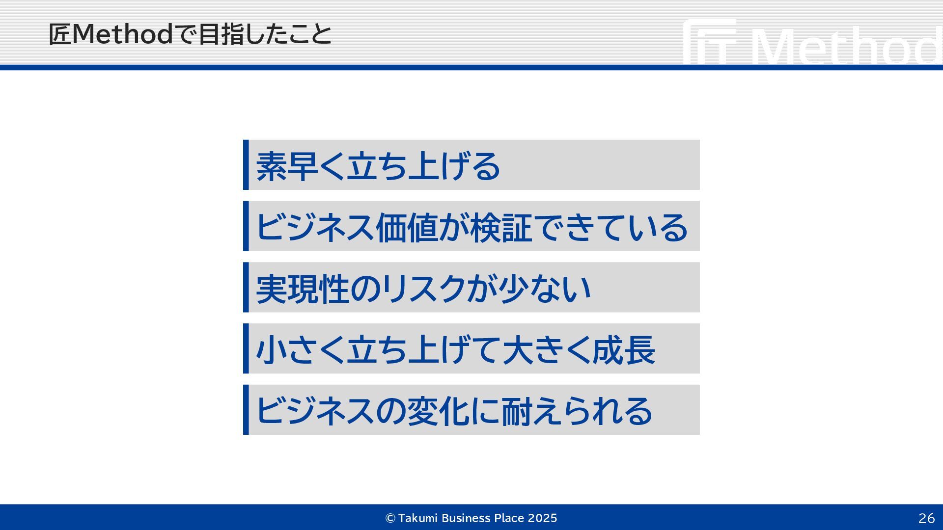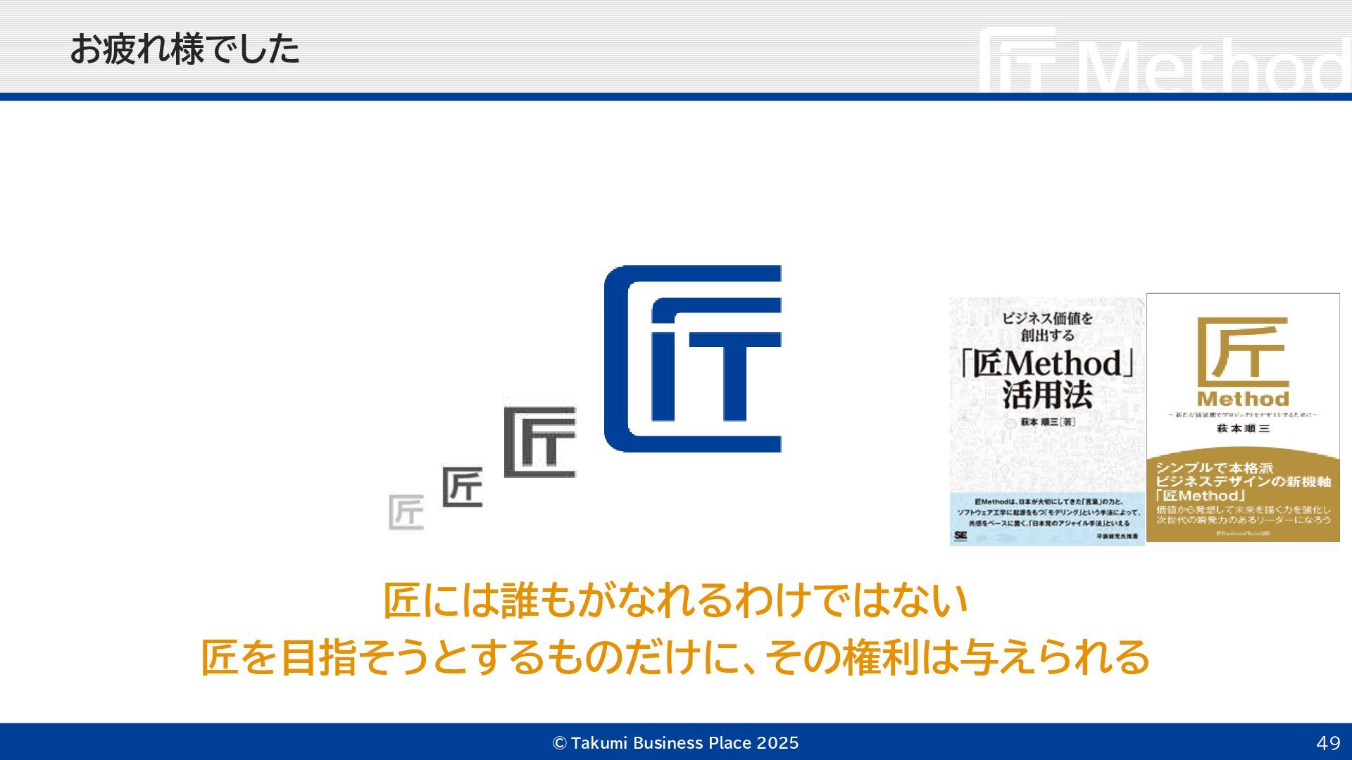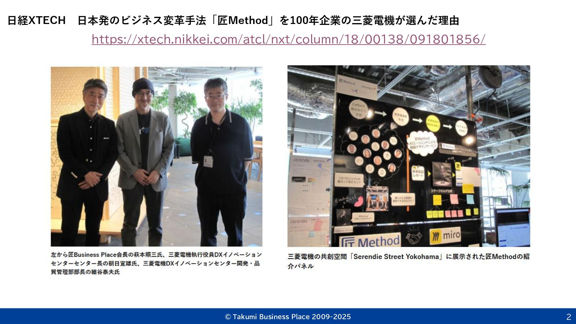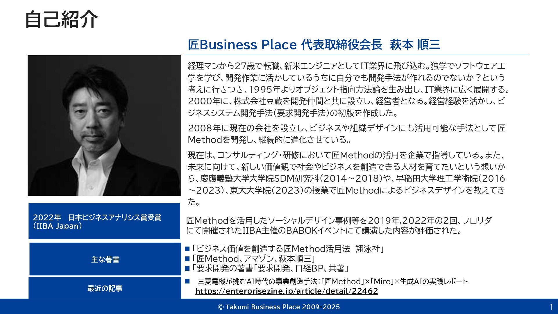 ジネスシステム開発手法(要求開発手法)の初版を作成した。 2008年に現在の会社を設立し、ビジネスや組織デザインにも活用可能な手法として匠 Methodを開発し、継続的に進化させている。 現在は、コンサルティング・研修において匠Methodの活用を企業で指導している。また、 未来に向けて、新しい価値観で社会やビジネスを創造できる人材を育てたいという想いか ら、慶應義塾大学大学院SDM研究科(2014~2018)や、早稲田大学理工学術院(2016 ~2023)、東大大学院(2023)の授業で匠Methodによるビジネスデザインを教えてき た。 ◼ 「ビジネス価値を創造する匠Method活用法 翔泳社」 ◼ 「匠Method、アマゾン、萩本順三」 ◼ 「要求開発の著書「要求開発、日経BP、共著」 匠Business Place 代表取締役会長 萩本 順三 匠Methodを活用したソーシャルデザイン事例等を2019年,2022年の2回、フロリダ にて開催されたIIBA主催のBABOKイベントにて講演した内容が評価された。 2022年 日本ビジネスアナリシス賞受賞 (IIBA Japan) 主な著書 自己紹介 ◼ 三菱電機が挑むAI時代の事業創造手法:「匠Method」×「Miro」×生成AIの実践レポート https://enterprisezine.jp/article/detail/22462 最近の記事