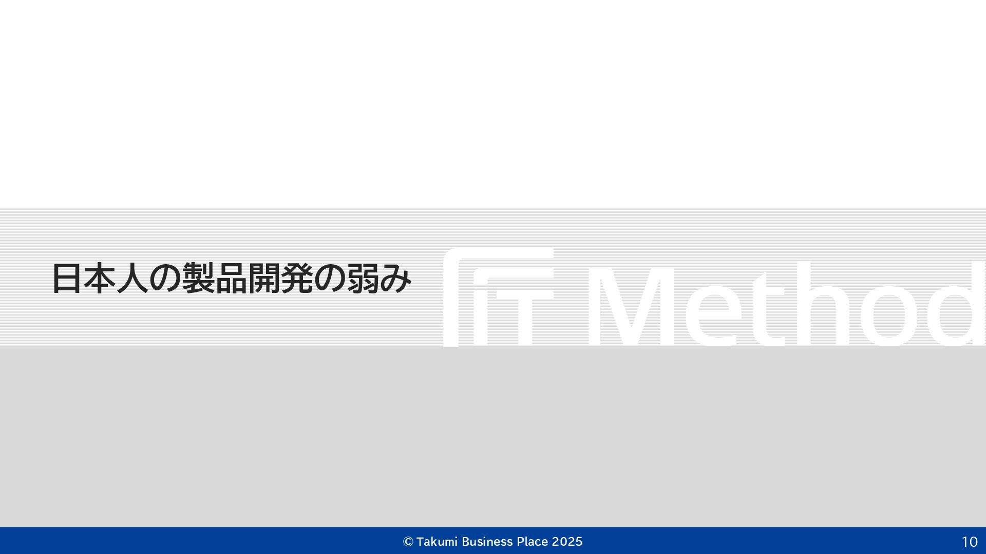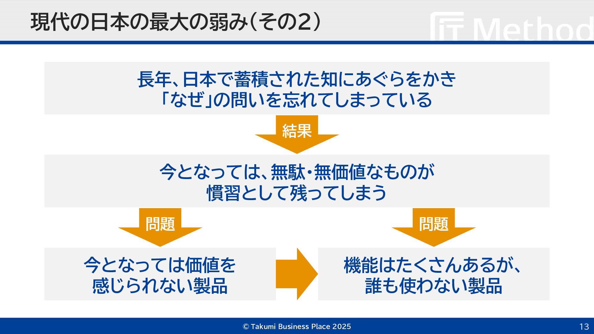 9. © Takumi Business Place 2025 現代の日本の最大の弱み(その2) 13 長年、日本で蓄積された知にあぐらをかき 「なぜ」の問いを忘れてしまっている 結果