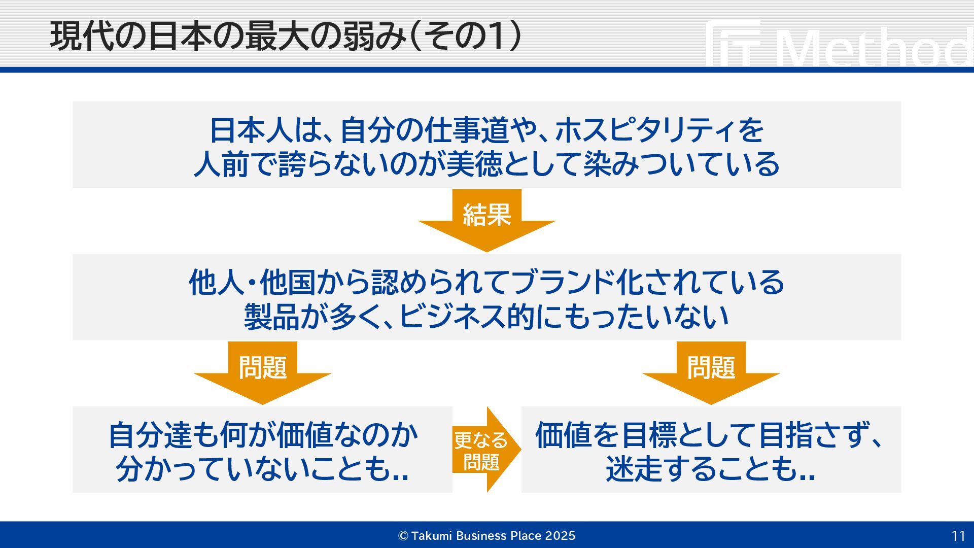 8. © Takumi Business Place 2025 現代の日本の最大の弱み(その1) 11 他人・他国から認められてブランド化されている 製品が多く、ビジネス的にもったいない 自分達も何が価値なのか