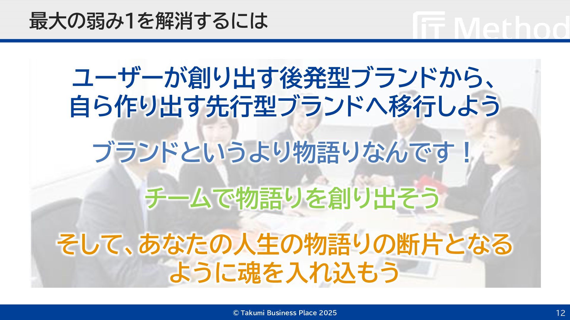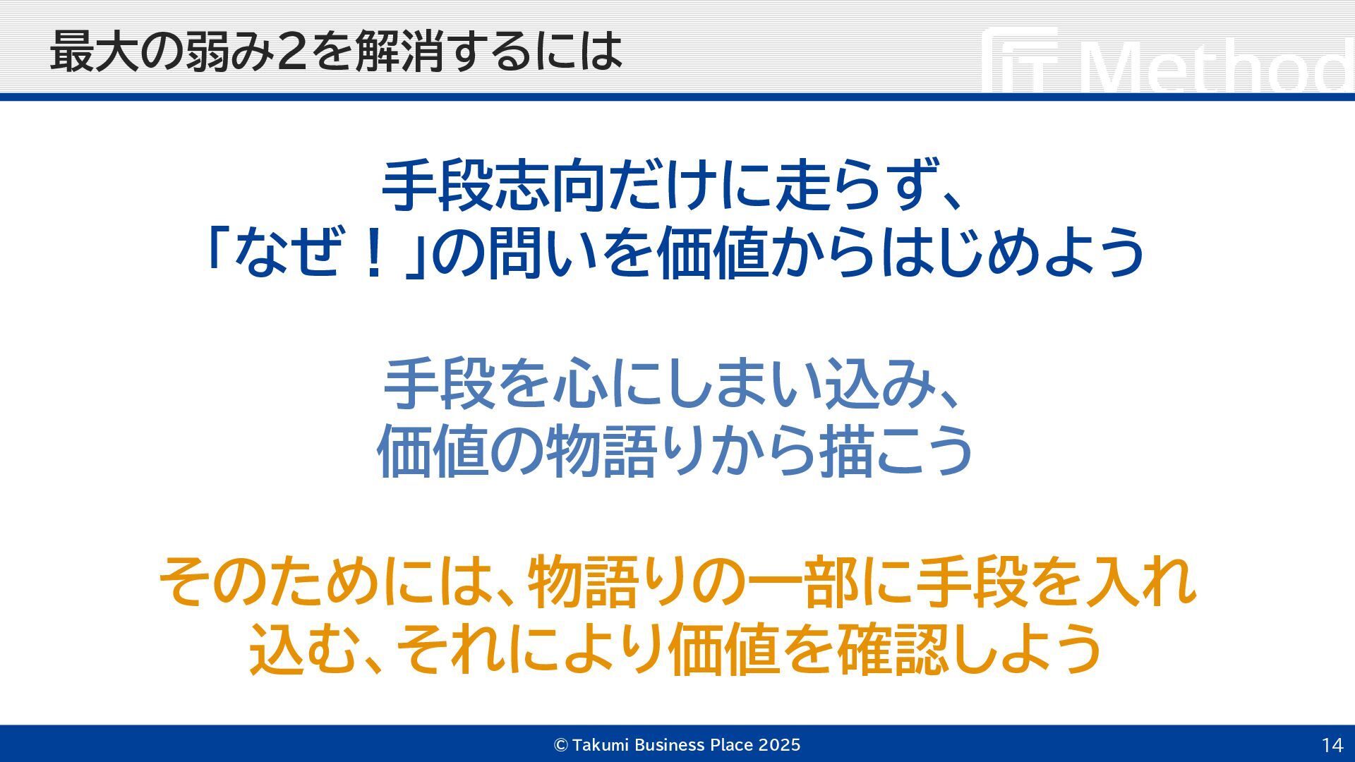 10. © Takumi Business Place 2025 最大の弱み2を解消するには 14 手段志向だけに走らず、 「なぜ!」の問いを価値からはじめよう 手段を心にしまい込み、