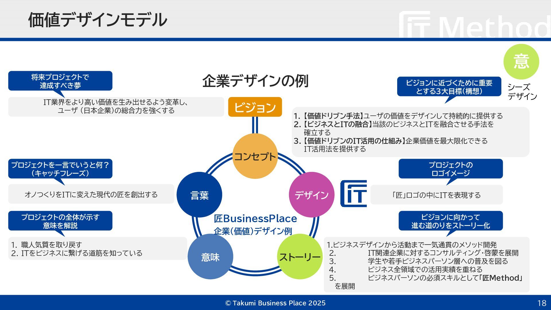 (日本企業)の総合力を強くする 1. 職人気質を取り戻す 2. ITをビジネスに繋げる道筋を知っている 1.ビジネスデザインから活動まで一気通貫のメソッド開発 2. IT関連企業に対するコンサルティング・啓蒙を展開 3. 学生や若手ビジネスパーソン層への普及を図る 4. ビジネス全領域での活用実績を重ねる 5. ビジネスパーソンの必須スキルとして「匠Method」 を展開 ビジョン コンセプト 言葉 意味 デザイン ストーリー 企業(価値)デザイン例 匠BusinessPlace 1. 【価値ドリブン手法】ユーザの価値をデザインして持続的に提供する 2. 【ビジネスとITの融合】当該のビジネスとITを融合させる手法を 確立する 3. 【価値ドリブンのIT活用の仕組み】企業価値を最大限化できる IT活用法を提供する 企業デザインの例 オノつくりをITに変えた現代の匠を創出する プロジェクトを一言でいうと何? (キャッチフレーズ) 将来プロジェクトで 達成すべき夢 ビジョンに近づくために重要 とする3大目標(構想) プロジェクトの ロゴイメージ ビジョンに向かって 進む道のりをストーリー化 プロジェクトの全体が示す 意味を解説 シーズ デザイン 意