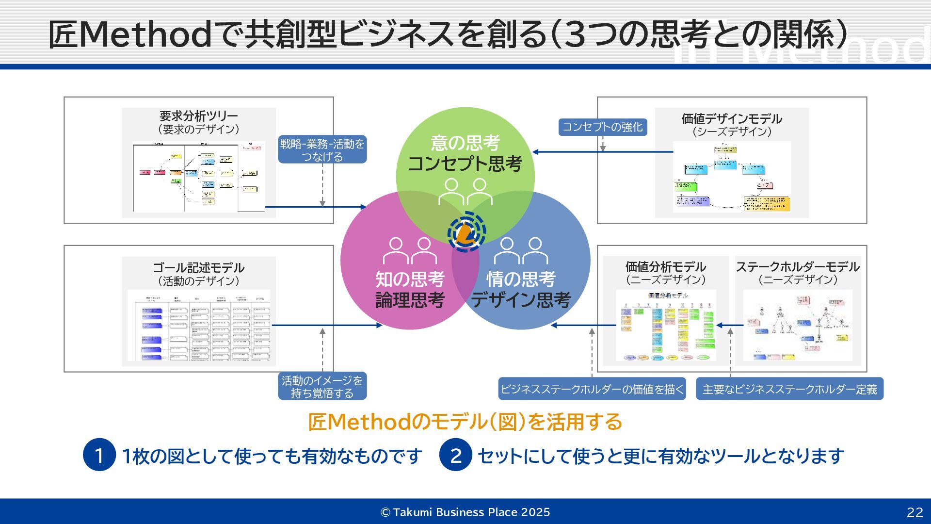 17. © Takumi Business Place 2025 匠Methodで共創型ビジネスを創る(3つの思考との関係) 22 情の思考 デザイン思考 知の思考
