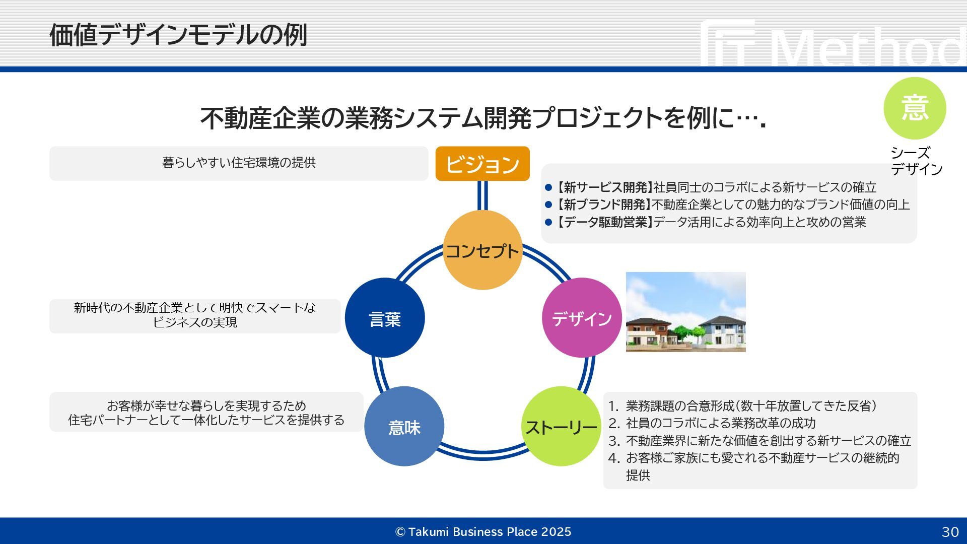 23. © Takumi Business Place 2025 価値デザインモデルの例 不動産企業の業務システム開発プロジェクトを例に…. 暮らしやすい住宅環境の提供 お客様が幸せな暮らしを実現するため 住宅パートナーとして一体化したサービスを提供する
