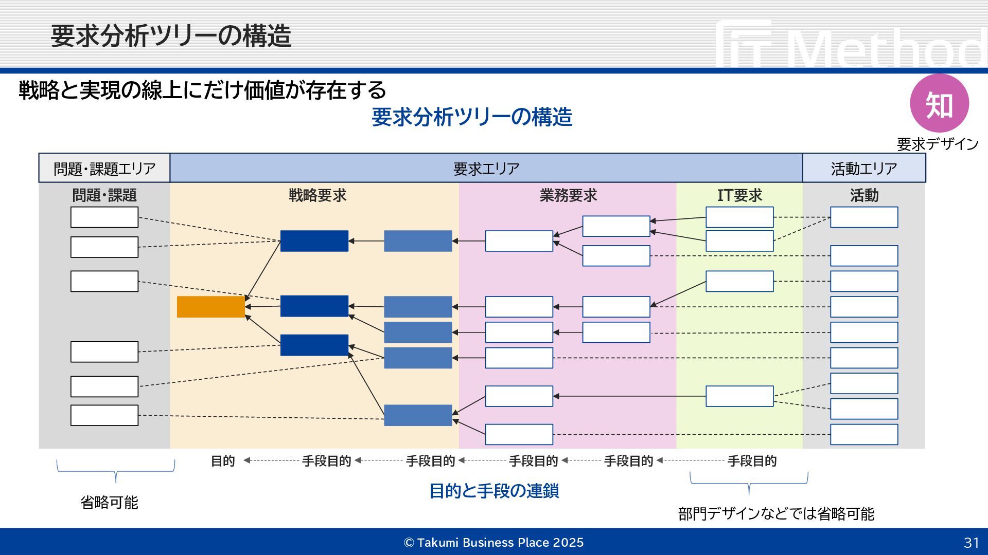 手段目的 手段目的 手段目的 手段目的 戦略要求 業務要求 IT要求 活動 問題・課題 要求分析ツリーの構造 部門デザインなどでは省略可能 省略可能 知 要求デザイン 戦略と実現の線上にだけ価値が存在する 問題・課題エリア 要求エリア 活動エリア