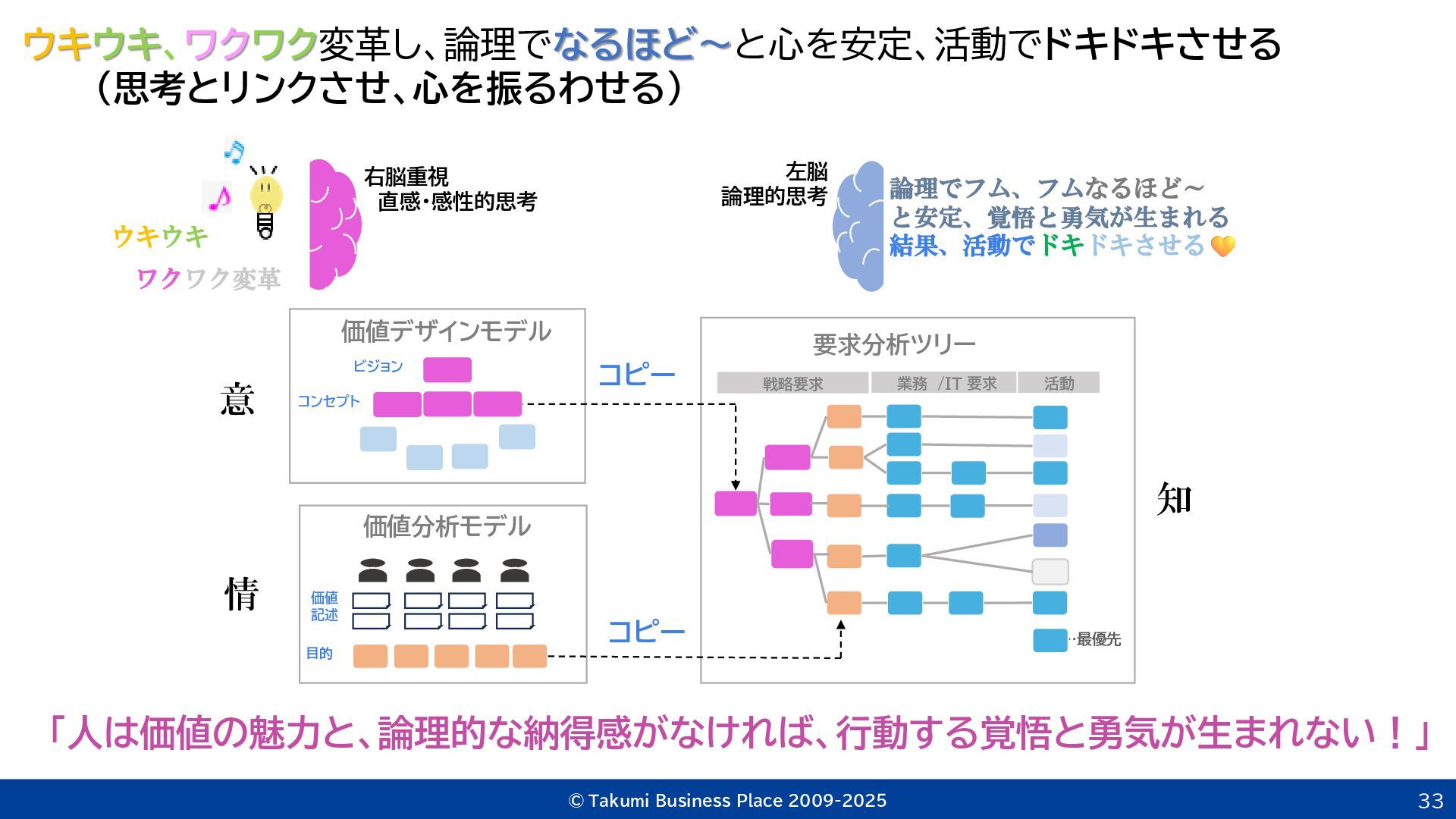 価値 記述 目的 要求分析ツリー 戦略要求 業務 /IT 要求 活動 コピー コピー …最優先 右脳重視 直感・感性的思考 左脳 論理的思考 意 情 知 ウキウキ ワクワク変革 論理でフム、フムなるほど~ と安定、覚悟と勇気が生まれる 結果、活動でドキドキさせる ウキウキ、ワクワク変革し、論理でなるほど~と心を安定、活動でドキドキさせる (思考とリンクさせ、心を振るわせる) 「人は価値の魅力と、論理的な納得感がなければ、行動する覚悟と勇気が生まれない!」