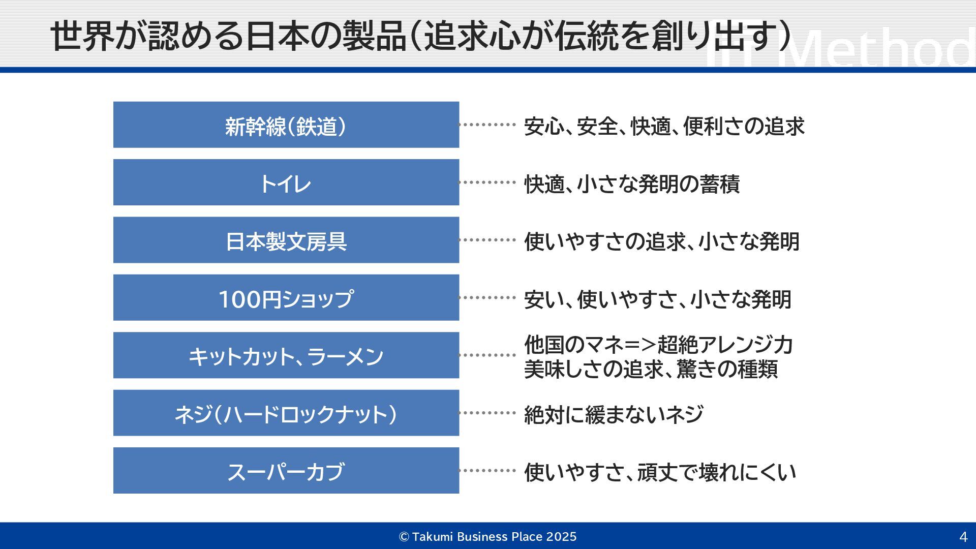 2. © Takumi Business Place 2025 世界が認める日本の製品(追求心が伝統を創り出す) 4 新幹線(鉄道) トイレ 日本製文房具