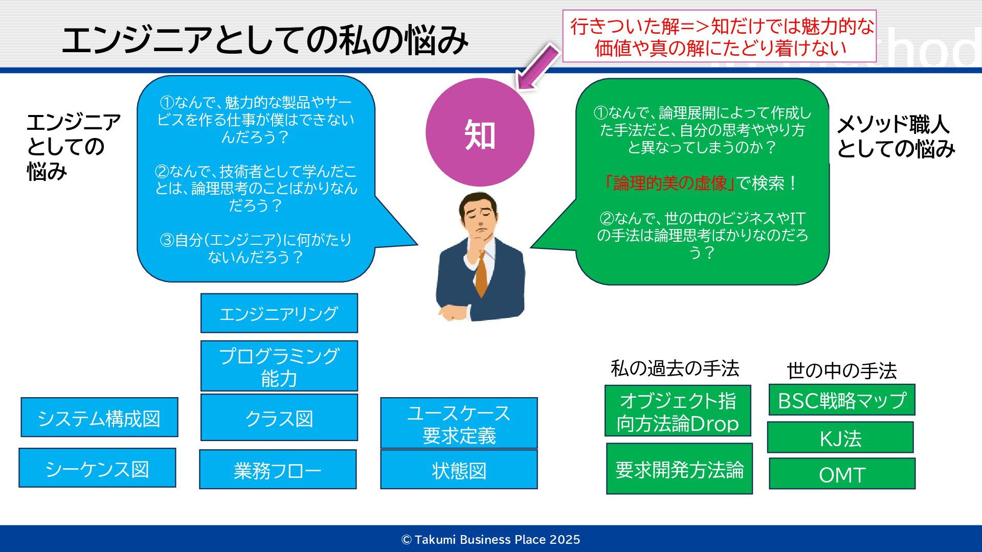 状態図 業務フロー ユースケース 要求定義 プログラミング 能力 ①なんで、魅力的な製品やサー ビスを作る仕事が僕はできない んだろう? ②なんで、技術者として学んだこ とは、論理思考のことばかりなん だろう? ③自分(エンジニア)に何がたり ないんだろう? エンジニア としての 悩み ①なんで、論理展開によって作成し た手法だと、自分の思考ややり方 と異なってしまうのか? 「論理的美の虚像」で検索! ②なんで、世の中のビジネスやIT の手法は論理思考ばかりなのだろ う? メソッド職人 としての悩み オブジェクト指 向方法論Drop 要求開発方法論 私の過去の手法 BSC戦略マップ 世の中の手法 KJ法 OMT 知 行きついた解=>知だけでは魅力的な 価値や真の解にたどり着けない