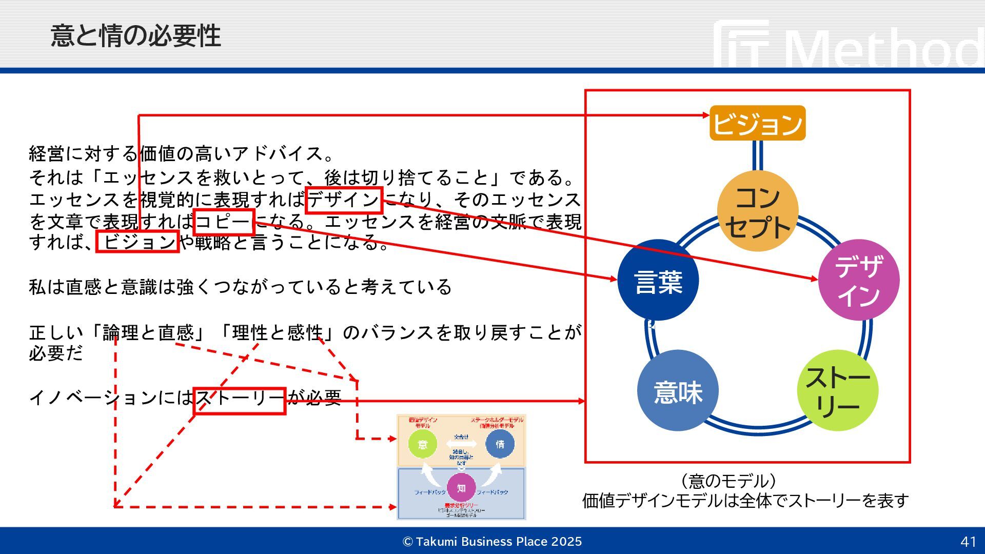 33. © Takumi Business Place 2025 意と情の必要性 41 経営に対する価値の高いアドバイス。 それは「エッセンスを救いとって、後は切り捨てること」である。 エッセンスを視覚的に表現すればデザインになり、そのエッセンス