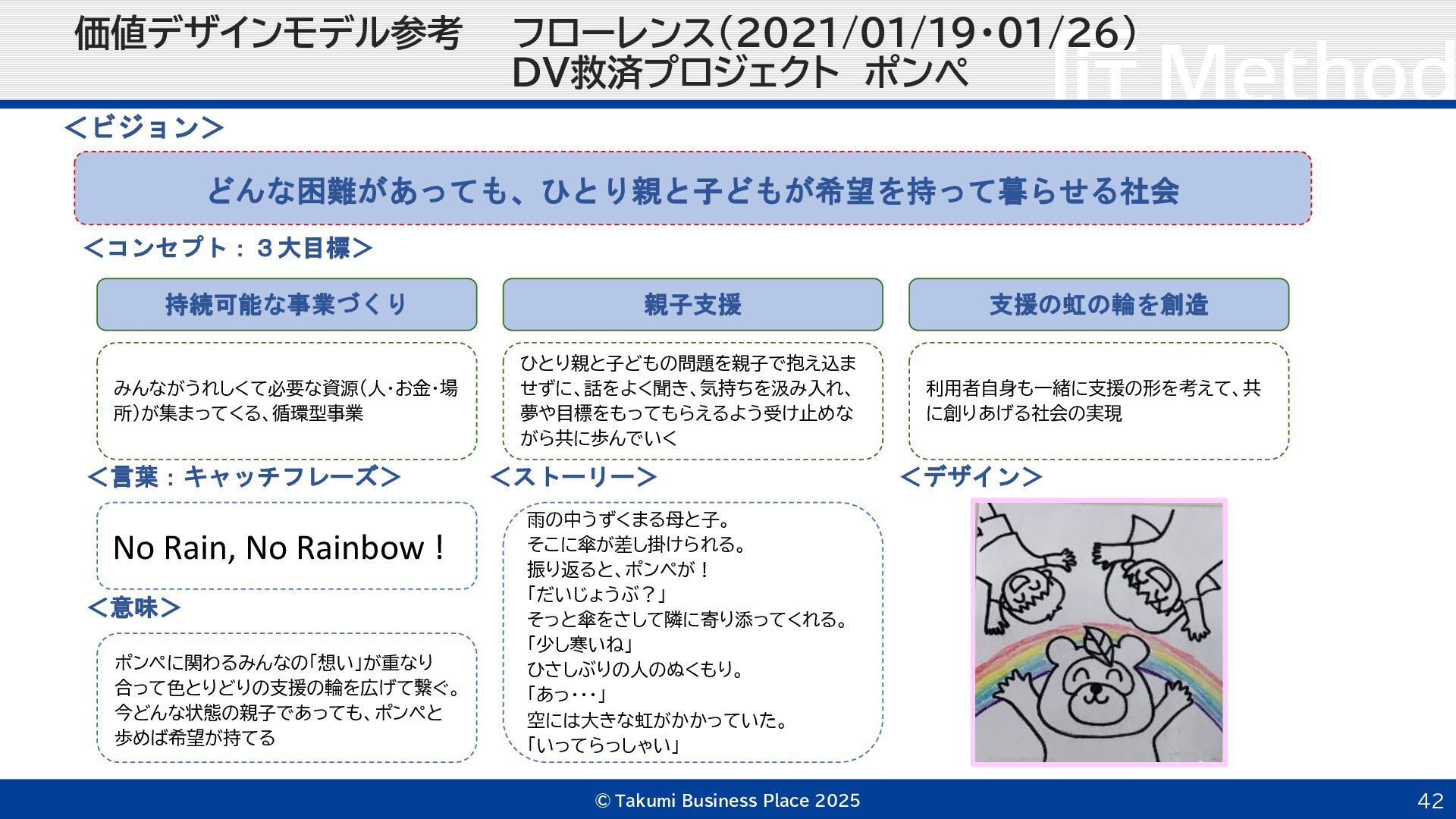 34. © Takumi Business Place 2025 価値デザインモデル参考 フローレンス(2021/01/19・01/26) DV救済プロジェクト ポンぺ 42