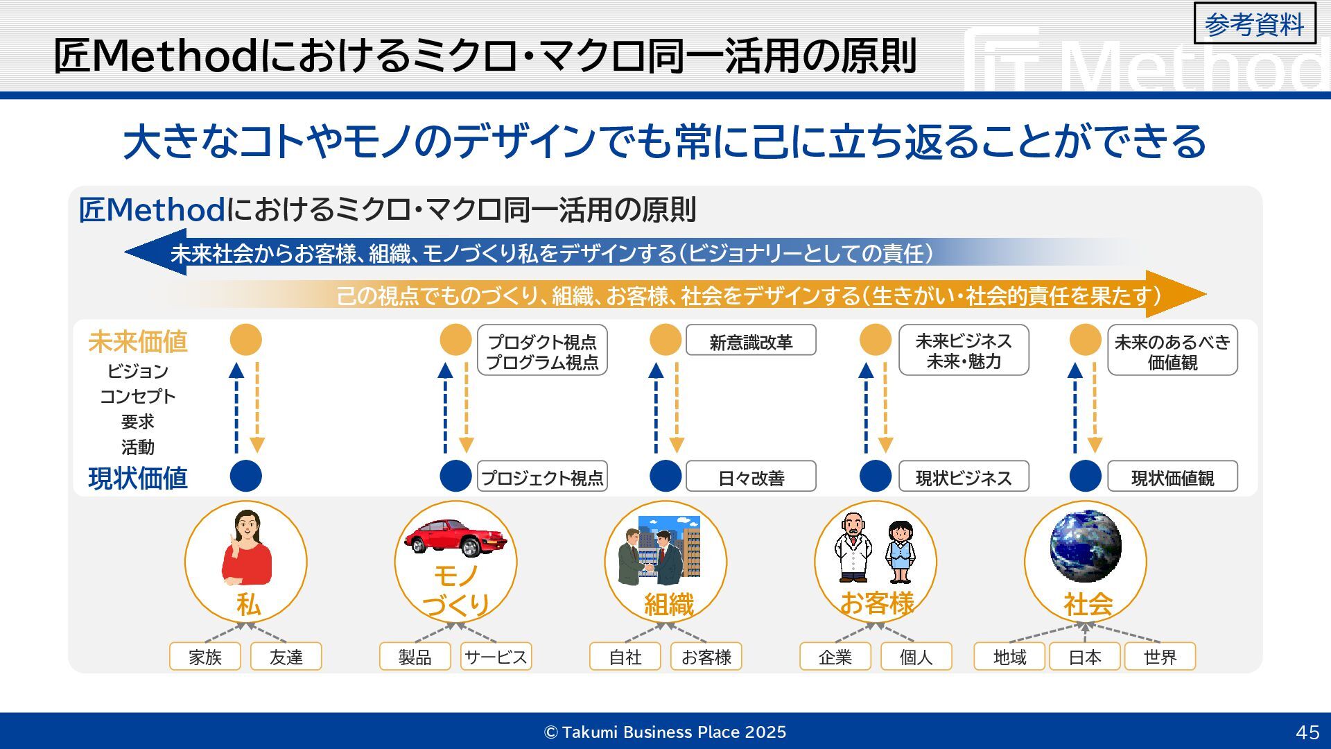お客様 企業 地域 個人 日本 世界 大きなコトやモノのデザインでも常に己に立ち返ることができる 匠Methodにおけるミクロ・マクロ同一活用の原則 家族 友達 現状価値観 プロジェクト視点 プロダクト視点 プログラム視点 日々改善 新意識改革 未来ビジネス 未来・魅力 現状ビジネス 未来のあるべき 価値観 現状価値 未来価値 ビジョン コンセプト 要求 活動 私 未来社会からお客様、組織、モノづくり私をデザインする(ビジョナリーとしての責任) 己の視点でものづくり、組織、お客様、社会をデザインする(生きがい・社会的責任を果たす) 社会 お客様 組織 モノ づくり 参考資料
