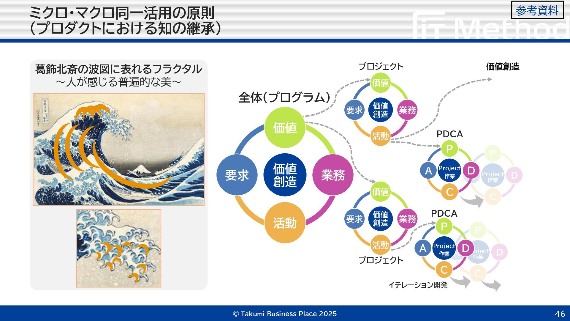 38. © Takumi Business Place 2025 ミクロ・マクロ同一活用の原則 (プロダクトにおける知の継承) 46 葛飾北斎の波図に表れるフラクタル ~人が感じる普遍的な美~